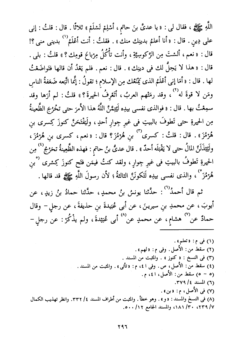 اللَّهِ صَلَّى اللَّهُ عَلَيْهِ وَسَلَّمَ فَقَالَ لِي: «يَا عَدِيَّ بْنَ حَاتِمٍ أَسْلِمْ تَسْلَمْ " ثَلَاثًا. قَالَ: قُلْتُ: إِنِّي عَلَى دِينٍ. قَالَ: " أَنَا أَعْلَمُ بِدِينِكَ مِنْكَ ". فَقُلْتُ: أَنْتَ أَعْلَمُ بِدِينِي مِنِّي؟ ! قَالَ: " نَعَمْ، أَلَسْتَ مِنَ الرَّكُوسِيَّةِ، وَأَنْتَ تَأْكُلُ مِرْبَاعَ قَوْمِكَ؟ " قُلْتُ: بَلَى. قَالَ: " هَذَا لَا يَحِلُّ لَكَ فِي دِينِكَ ". قَالَ: نَعَمْ. فَلَمْ يَعْدُ أَنْ قَالَهَا فَتَوَاضَعْتُ لَهَا. قَالَ: " أَمَا إِنِّي أَعْلَمُ الَّذِي يَمْنَعُكَ مِنَ الْإِسْلَامِ ; تَقُولُ: إِنَّمَا اتَّبَعَهُ ضَعَفَةُ النَّاسِ وَمَنْ لَا قُوَّةَ لَهُ، وَقَدْ رَمَتْهُمُ الْعَرَبُ. أَتَعْرِفُ الْحِيرَةَ؟ " قُلْتُ: لَمْ أَرَهَا وَقَدْ سَمِعْتُ بِهَا. قَالَ: " فَوَالَّذِي نَفْسِي بِيَدِهِ لَيُتِمَّنَّ اللَّهُ هَذَا الْأَمْرَ حَتَّى تَخْرُجَ الظَّعِينَةُ مِنَ الْحِيرَةِ حَتَّى تَطُوفَ بِالْبَيْتِ فِي غَيْرِ جِوَارِ أَحَدٍ، وَلَيَفْتَحَنَّ كُنُوزَ كِسْرَى بْنِ هُرْمُزَ ". قَالَ: قُلْتُ: كِسْرَى بْنَ هُرْمُزَ؟ ! قَالَ: " نَعَمْ كِسْرَى بْنَ هُرْمُزَ وَلَيُبْذَلَنَّ الْمَالُ حَتَّى لَا يَقْبَلَهُ أَحَدٌ ". قَالَ عَدِيُّ بْنُ حَاتِمٍ فَهَذِهِ الظَّعِينَةُ تَخْرُجُ مِنَ الْحِيرَةِ تَطُوفُ بِالْبَيْتِ فِي غَيْرِ جِوَارٍ، وَلَقَدْ كُنْتُ فِيمَنْ فَتَحَ كُنُوزَ كِسْرَى بْنِ هُرْمُزَ وَالَّذِي نَفْسِي بِيَدِهِ لَتَكُونَنَّ الثَّالِثَةُ ; لِأَنَّ رَسُولَ اللَّهِ قَدْ قَالَهَا» .