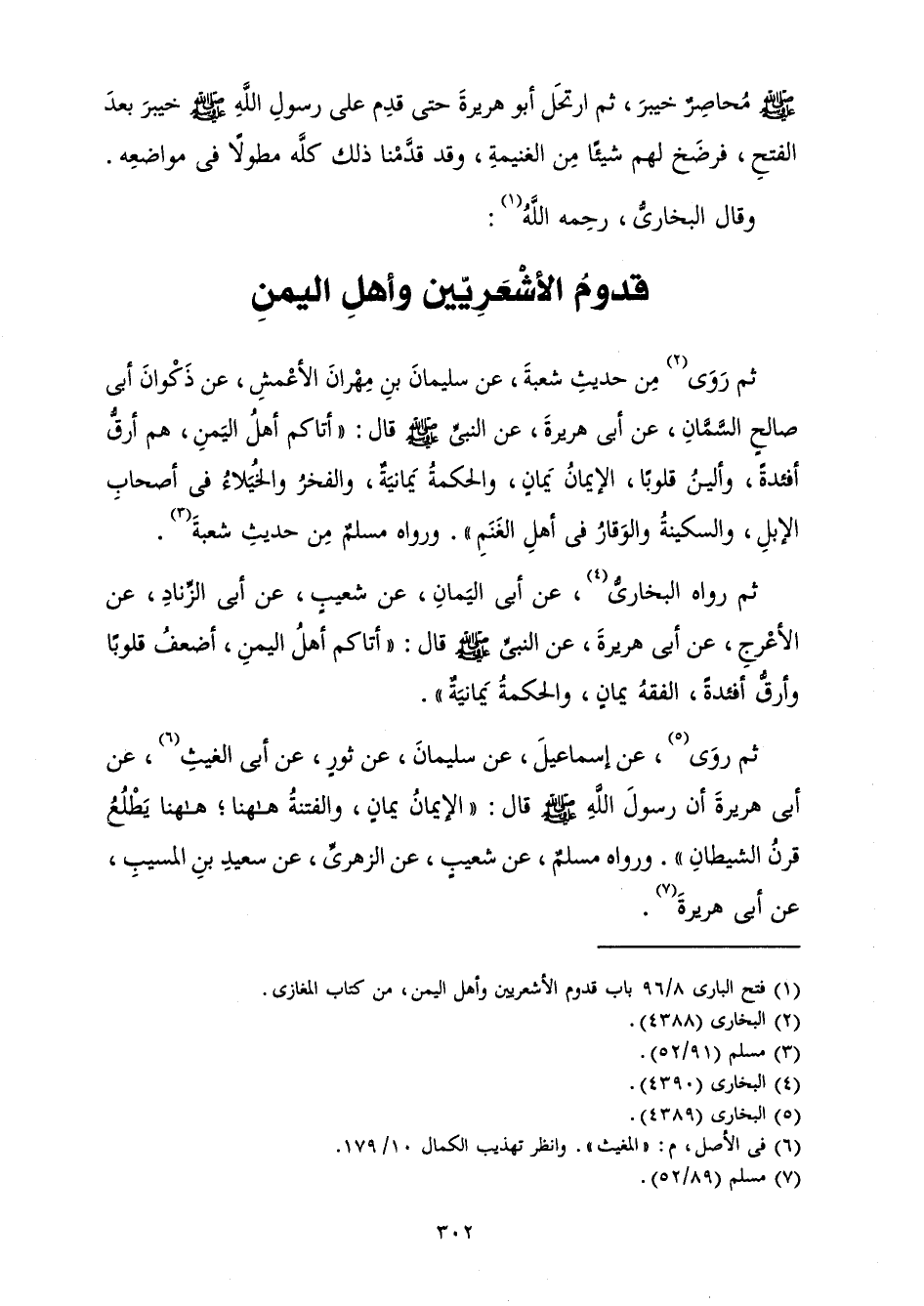 وَقَالَ الْبُخَارِيُّ رَحِمَهُ اللَّهُ: ثُمَّ رَوَى مِنْ حَدِيثِ شُعْبَةَ، عَنْ سُلَيْمَانَ بْنِ مِهْرَانَ الْأَعْمَشِ، عَنْ ذَكْوَانَ أَبِي صَالِحٍ السَّمَّانِ، عَنْ أَبِي هُرَيْرَةَ، عَنِ النَّبِيِّ صَلَّى اللَّهُ عَلَيْهِ وَسَلَّمَ قَالَ: «أَتَاكُمْ أَهْلُ الْيَمَنِ، هُمْ أَرَقُّ أَفْئِدَةً، وَأَلْيَنُ قُلُوبًا، الْإِيمَانُ يَمَانٍ، وَالْحِكْمَةُ يَمَانِيَةٌ، وَالْفَخْرُ وَالْخُيَلَاءُ فِي أَصْحَابِ الْإِبِلِ، وَالسَّكِينَةُ وَالْوَقَارُ فِي أَهْلِ الْغَنَمِ ".» وَرَوَاهُ مُسْلِمٌ مِنْ حَدِيثِ شُعْبَةَ.