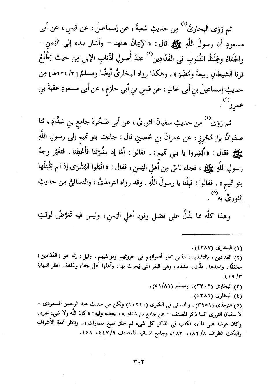 ثُمَّ رَوَى الْبُخَارِيُّ مِنْ حَدِيثِ شُعْبَةَ، عَنْ إِسْمَاعِيلَ، عَنْ قَيْسٍ، عَنْ أَبِي مَسْعُودٍ أَنَّ رَسُولَ اللَّهِ صَلَّى اللَّهُ عَلَيْهِ وَسَلَّمَ قَالَ: «الْإِيمَانُ هَاهُنَا - وَأَشَارَ بِيَدِهِ إِلَى الْيَمَنِ - وَالْجَفَاءُ وَغِلَظُ الْقُلُوبِ فِي الْفَدَّادِينَ عِنْدَ أُصُولِ أَذْنَابِ الْإِبِلِ مِنْ حَيْثُ يَطْلُعُ قَرْنَا الشَّيْطَانِ رَبِيعَةَ وَمُضَرَ ".» وَهَكَذَا رَوَاهُ الْبُخَارِيُّ أَيْضًا وَمُسْلِمٌ مِنْ حَدِيثِ إِسْمَاعِيلَ بْنِ أَبِي خَالِدٍ، عَنْ قَيْسِ بْنِ أَبِي حَازِمٍ، عَنْ أَبِي مَسْعُودٍ عُقْبَةَ بْنِ عَمْرٍو.