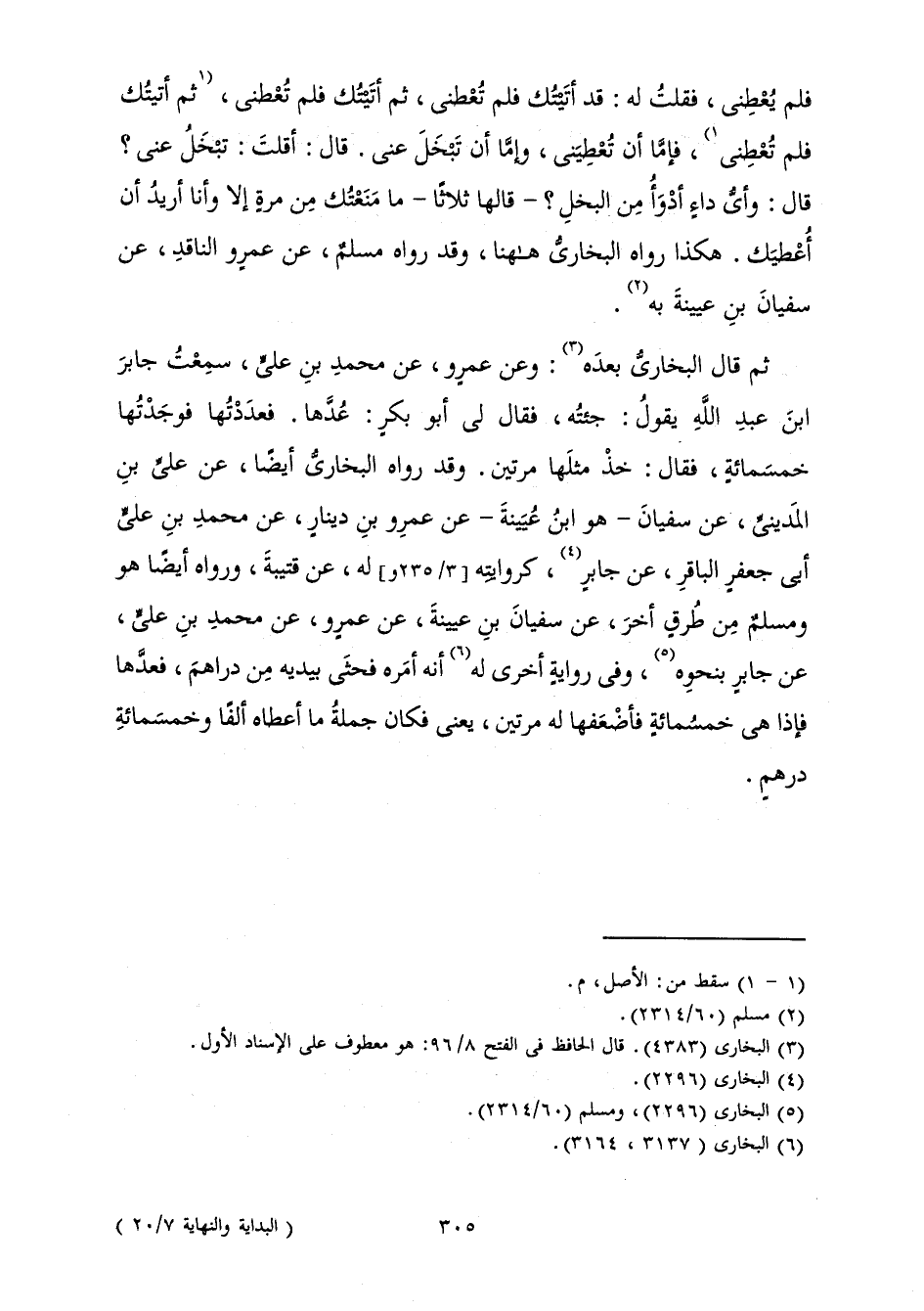 ثُمَّ قَالَ الْبُخَارِيُّ بَعْدَهُ: وَعَنْ عَمْرٍو، عَنْ مُحَمَّدِ بْنِ عَلِيٍّ، سَمِعْتُ جَابِرَ بْنَ عَبْدِ اللَّهِ يَقُولُ: جِئْتُهُ فَقَالَ لِي أَبُو بَكْرٍ: عُدَّهَا فَعَدَدْتُهَا. فَوَجَدْتُهَا خَمْسَمِائَةٍ، فَقَالَ: خُذْ مِثْلَهَا مَرَّتَيْنِ. وَقَدْ رَوَاهُ الْبُخَارِيُّ أَيْضًا عَنْ عَلِيِّ بْنِ الْمَدِينِيِّ، عَنْ سُفْيَانَ - هُوَ ابْنُ عُيَيْنَةَ - عَنْ عَمْرِو بْنِ دِينَارٍ عَنْ مُحَمَّدِ بْنِ عَلِيٍّ أَبِي جَعْفَرٍ الْبَاقِرِ، عَنْ جَابِرٍ كَرِوَايَتِهِ لَهُ، عَنْ قُتَيْبَةَ، وَرَوَاهُ أَيْضًا هُوَ وَمُسْلِمٌ مِنْ طُرُقٍ أُخَرَ، عَنْ سُفْيَانَ بْنِ عُيَيْنَةَ، عَنْ عَمْرٍو، عَنْ مُحَمَّدِ بْنِ عَلِيٍّ، عَنْ جَابِرٍ بِنَحْوِهِ، وَفِي رِوَايَةٍ أُخْرَى لَهُ أَنَّهُ أَمَرَهُ فَحَثَى بِيَدَيْهِ مِنْ دَرَاهِمَ، فَعَدَّهَا فَإِذَا هِيَ خَمْسُمِائَةٍ فَأَضْعَفَهَا لَهُ مَرَّتَيْنِ، يَعْنِي فَكَانَ جُمْلَةُ مَا أَعْطَاهُ أَلْفًا وَخَمْسَمِائَةِ دِرْهَمٍ.