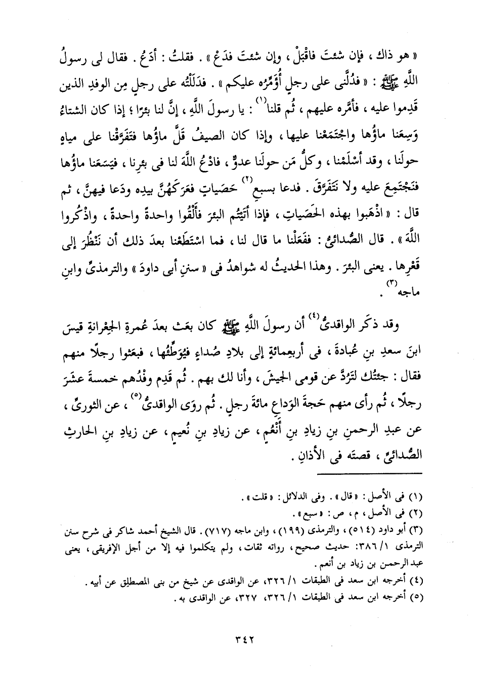 " هُوَ ذَاكَ فَإِنْ شِئْتَ فَاقْبَلْ وَإِنْ شِئْتَ فَدَعْ ". فَقُلْتُ: أَدَعُ. فَقَالَ لِي رَسُولُ اللَّهِ صَلَّى اللَّهُ عَلَيْهِ وَسَلَّمَ: " فَدُلَّنِي عَلَى رَجُلٍ أُؤَمِّرُهُ عَلَيْكُمْ ". فَدَلَلْتُهُ عَلَى رَجُلٍ مِنَ الْوَفْدِ الَّذِينَ قَدِمُوا عَلَيْهِ، فَأَمَّرَهُ عَلَيْهِمْ، ثُمَّ قُلْنَا: يَا رَسُولَ اللَّهِ إِنَّ لَنَا بِئْرًا إِذَا كَانَ الشِّتَاءُ وَسِعَنَا مَاؤُهَا وَاجْتَمَعْنَا عَلَيْهَا، وَإِذَا كَانَ الصَّيْفُ قَلَّ مَاؤُهَا فَتَفَرَّقْنَا عَلَى مِيَاهٍ حَوْلَنَا، وَقَدْ أَسْلَمْنَا، وَكُلُّ مَنْ حَوْلَنَا عَدُوٌّ، فَادْعُ اللَّهَ لَنَا فِي بِئْرِنَا، فَيَسَعَنَا مَاؤُهَا فَنَجْتَمِعَ عَلَيْهِ وَلَا نَتَفَرَّقَ. فَدَعَا بِسَبْعِ حَصَيَاتٍ فَعَرَكَهُنَّ بِيَدِهِ وَدَعَا فِيهِنَّ، ثُمَّ قَالَ: " اذْهَبُوا بِهَذِهِ الْحَصَيَاتِ، فَإِذَا أَتَيْتُمُ الْبِئْرَ فَأَلْقُوا وَاحِدَةً وَاحِدَةً، وَاذْكُرُوا اللَّهَ ". قَالَ الصُّدَائِيُّ: فَفَعَلْنَا مَا قَالَ لَنَا، فَمَا اسْتَطَعْنَا بَعْدَ ذَلِكَ أَنْ نَنْظُرَ إِلَى قَعْرِهَا. يَعْنِي الْبِئْرَ.» وَهَذَا الْحَدِيثُ لَهُ شَوَاهِدُ فِي " سُنَنِ أَبِي دَاوُدَ " وَالتِّرْمِذِيِّ وَابْنِ مَاجَهْ.
