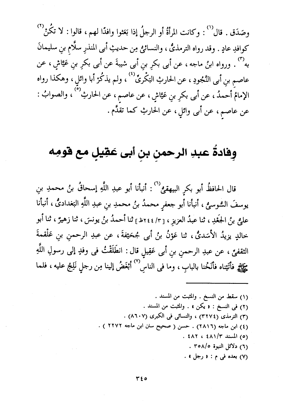 قَالَ الْحَافِظُ أَبُو بَكْرٍ الْبَيْهَقِيُّ: أَنْبَأَنَا أَبُو عَبْدِ اللَّهِ إِسْحَاقُ بْنُ مُحَمَّدِ بْنِ يُوسُفَ السُّوسِيُّ، أَنْبَأَنَا أَبُو جَعْفَرٍ مُحَمَّدُ بْنُ مُحَمَّدِ بْنِ عَبْدِ اللَّهِ الْبَغْدَادِيُّ، أَنْبَأَنَا عَلِيُّ بْنُ الْجَعْدِ، ثَنَا عَبْدُ الْعَزِيزِ، ثَنَا أَحْمَدُ بْنُ يُونُسَ، ثَنَا زُهَيْرٌ، ثَنَا أَبُو خَالِدٍ يَزِيدُ الْأَسَدِيُّ، ثَنَا عَوْنُ بْنُ أَبِي جُحَيْفَةَ، عَنْ عَبْدِ الرَّحْمَنِ بْنِ عَلْقَمَةَ الثَّقَفِيِّ، عَنْ عَبْدِ الرَّحْمَنِ بْنِ أَبِي عَقِيلٍ قَالَ: «انْطَلَقْتُ فِي وَفْدٍ إِلَى رَسُولِ اللَّهِ صَلَّى اللَّهُ عَلَيْهِ وَسَلَّمَ فَأَتَيْنَاهُ فَأَنَخْنَا بِالْبَابِ، وَمَا فِي النَّاسِ أَبْغَضُ إِلَيْنَا مِنْ رَجُلٍ نَلِجُ عَلَيْهِ، فَلَمَّا
