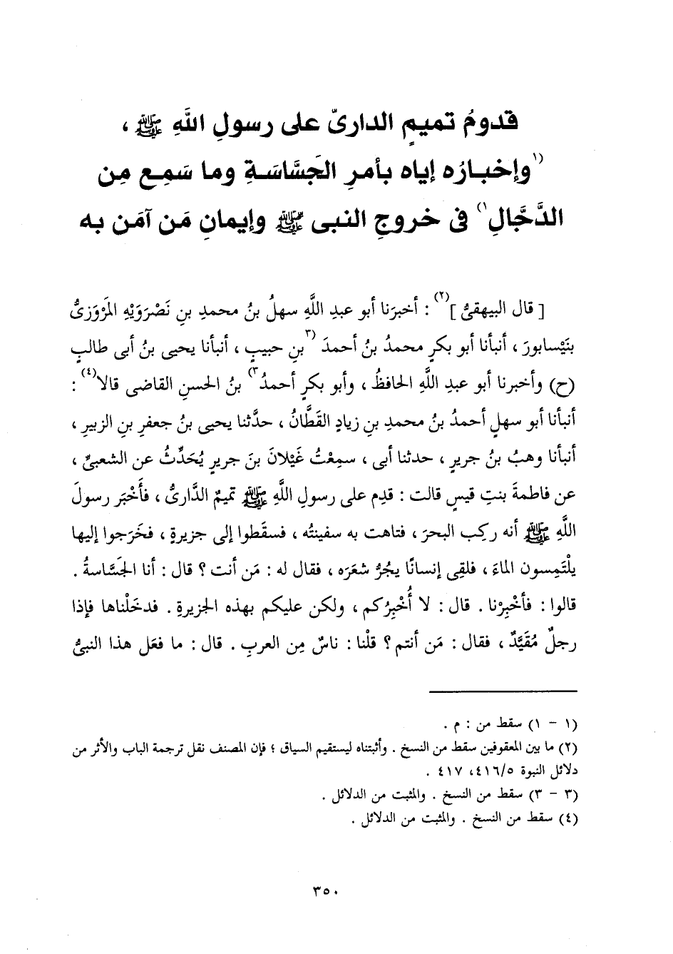 [قَالَ الْبَيْهَقِيُّ] : أَخْبَرَنَا أَبُو عَبْدِ اللَّهِ سَهْلُ بْنُ مُحَمَّدِ بْنِ نَصْرَوَيْهِ الْمَرْوَزِيُّ بِنَيْسَابُورَ، أَنْبَأَنَا أَبُو بَكْرٍ مُحَمَّدُ بْنُ أَحْمَدَ بْنِ حَبِيبٍ، أَنْبَأَنَا يَحْيَى بْنُ أَبِي طَالِبٍ، (ح) وَأَخْبَرَنَا أَبُو عَبْدِ اللَّهِ الْحَافِظُ، وَأَبُو بَكْرٍ أَحْمَدُ بْنُ الْحَسَنِ الْقَاضِي قَالَا: أَنْبَأَنَا أَبُو سَهْلٍ أَحْمَدُ بْنُ مُحَمَّدِ بْنِ زِيَادٍ الْقَطَّانُ، حَدَّثَنَا يَحْيَى بْنُ جَعْفَرِ بْنِ الزُّبَيْرِ، أَنْبَأَنَا وَهْبُ بْنُ جَرِيرٍ، حَدَّثَنَا أَبِي، سَمِعْتُ غَيْلَانَ بْنَ جَرِيرٍ يُحَدِّثُ عَنِ الشَّعْبِيِّ، عَنْ فَاطِمَةَ بِنْتِ قَيْسٍ قَالَتْ: قَدِمَ عَلَى رَسُولِ اللَّهِ صَلَّى اللَّهُ عَلَيْهِ وَسَلَّمَ تَمِيمٌ الدَّارِيُّ، فَأَخْبَرَ رَسُولَ اللَّهِ صَلَّى اللَّهُ عَلَيْهِ وَسَلَّمَ أَنَّهُ رَكِبَ الْبَحْرَ، فَتَاهَتْ بِهِ سَفِينَتُهُ، فَسَقَطُوا إِلَى جَزِيرَةٍ، فَخَرَجُوا إِلَيْهَا يَلْتَمِسُونَ الْمَاءَ، فَلَقِيَ إِنْسَانًا يَجُرُّ شَعْرَهُ، فَقَالَ لَهُ: مَنْ أَنْتَ؟ قَالَ: أَنَا الْجَسَّاسَةُ. قَالُوا: فَأَخْبِرْنَا. قَالَ: لَا أُخْبِرُكُمْ، وَلَكِنْ عَلَيْكُمْ بِهَذِهِ الْجَزِيرَةِ. فَدَخَلْنَاهَا فَإِذَا رَجُلٌ مُقَيَّدٌ فَقَالَ: مَنْ أَنْتُمْ؟ قُلْنَا: نَاسٌ مِنَ الْعَرَبِ. قَالَ: مَا فَعَلَ هَذَا النَّبِيُّ