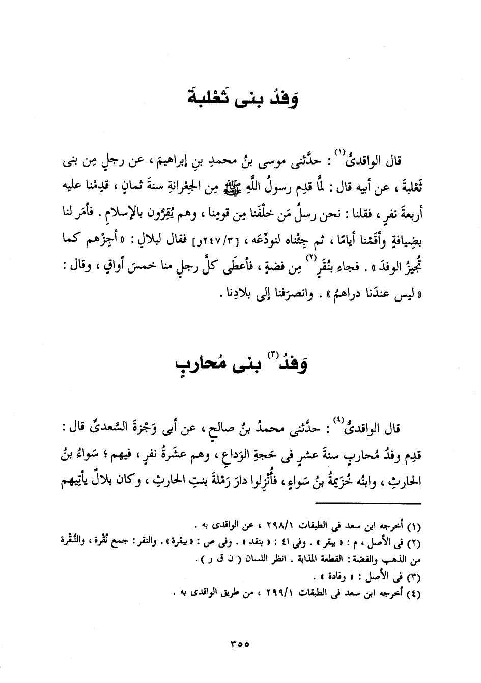 قَالَ الْوَاقِدِيُّ: حَدَّثَنِي مُوسَى بْنُ مُحَمَّدِ بْنِ إِبْرَاهِيمَ، عَنْ رَجُلٍ مِنْ بَنِي ثَعْلَبَةَ، عَنْ أَبِيهِ قَالَ: «لَمَّا قَدِمَ رَسُولُ اللَّهِ صَلَّى اللَّهُ عَلَيْهِ وَسَلَّمَ مِنَ الْجِعْرَانَةَ سَنَةَ ثَمَانٍ، قَدِمْنَا عَلَيْهِ أَرْبَعَةَ نَفَرٍ، فَقُلْنَا: نَحْنُ رُسُلُ مَنْ خَلْفَنَا مِنْ قَوْمِنَا، وَهُمْ يُقِرُّونَ بِالْإِسْلَامِ. فَأَمَرَ لَنَا بِضِيَافَةٍ وَأَقَمْنَا أَيَّامًا، ثُمَّ جِئْنَاهُ لِنُوَدِّعَهُ، فَقَالَ لِبِلَالٍ: " أَجْزِهِمْ كَمَا تُجِيزُ الْوَفْدَ ". فَجَاءَ بِنُقَرٍ مِنْ فِضَّةٍ، فَأَعْطَى كُلَّ رَجُلٍ مِنَّا خَمْسَ أَوَاقٍ، وَقَالَ: " لَيْسَ عِنْدَنَا دَرَاهِمُ ".» وَانْصَرَفْنَا إِلَى بِلَادِنَا.
