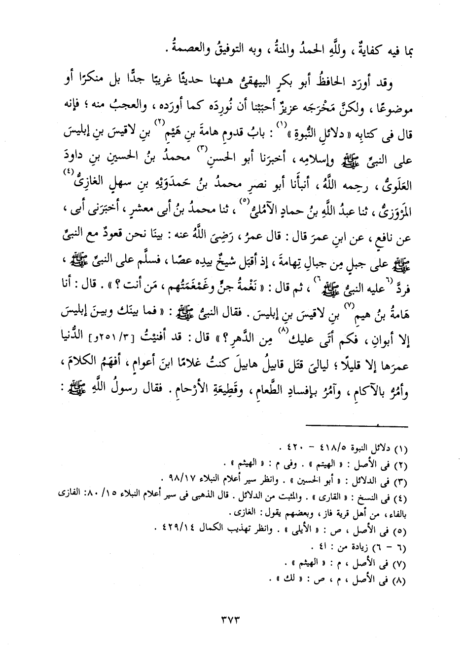 وَقَدْ أَوْرَدَ الْحَافِظُ أَبُو بَكْرٍ الْبَيْهَقِيُّ هَاهُنَا حَدِيثًا غَرِيبًا جِدًّا بَلْ مُنْكَرًا أَوْ مَوْضُوعًا، وَلَكِنَّ مَخْرَجَهُ عَزِيزٌ أَحْبَبْنَا أَنْ نُورِدَهُ كَمَا أَوْرَدَهُ، وَالْعَجَبُ مِنْهُ ; فَإِنَّهُ قَالَ فِي كِتَابِهِ " دَلَائِلِ النُّبُوَّةِ ": بَابُ قُدُومِ هَامَةَ بْنِ هَيْمِ بْنِ لَاقِيسَ بْنِ إِبْلِيسَ عَلَى النَّبِيِّ صَلَّى اللَّهُ عَلَيْهِ وَسَلَّمَ وَإِسْلَامِهِ، أَخْبَرَنَا أَبُو الْحَسَنِ مُحَمَّدُ بْنُ الْحُسَيْنِ بْنِ دَاوُدَ الْعَلَوِيُّ، رَحِمَهُ اللَّهُ، أَنْبَأَنَا أَبُو نَصْرٍ مُحَمَّدُ بْنُ حَمْدَوَيْهِ بْنِ سَهْلٍ الْغَازِيُّ الْمَرْوَزِيُّ، ثَنَا عَبْدُ اللَّهِ بْنُ حَمَّادٍ الْآمُلِيُّ، ثَنَا مُحَمَّدُ بْنُ أَبِي مَعْشَرٍ، أَخْبَرَنِي أَبِي، عَنْ نَافِعٍ، عَنِ ابْنِ عُمَرَ قَالَ: «قَالَ عُمَرُ، رَضِيَ اللَّهُ عَنْهُ: بَيْنَا نَحْنُ قُعُودٌ مَعَ النَّبِيِّ صَلَّى اللَّهُ عَلَيْهِ وَسَلَّمَ عَلَى جَبَلٍ مِنْ جِبَالِ تِهَامَةَ، إِذْ أَقْبَلَ شَيْخٌ بِيَدِهِ عَصًا، فَسَلَّمَ عَلَى النَّبِيِّ صَلَّى اللَّهُ عَلَيْهِ وَسَلَّمَ، فَرَدَّ عَلَيْهِ النَّبِيُّ صَلَّى اللَّهُ عَلَيْهِ وَسَلَّمَ، ثُمَّ قَالَ: " نَغْمَةُ جِنٍّ وَغَمْغَمَتُهُمْ، مَنْ أَنْتَ؟ ". قَالَ: أَنَا هَامَةُ بْنُ هَيْمِ بْنِ لَاقِيسَ بْنِ إِبْلِيسَ. فَقَالَ النَّبِيُّ صَلَّى اللَّهُ عَلَيْهِ وَسَلَّمَ: " فَمَا بَيْنَكَ وَبَيْنَ إِبْلِيسَ إِلَّا أَبَوَانِ فَكَمْ أَتَى عَلَيْكَ مِنَ الدَّهْرِ؟ " قَالَ: قَدْ أَفْنَيْتُ الدُّنْيَا عُمْرَهَا إِلَّا قَلِيلًا ; لَيَالِيَ قَتَلَ قَابِيلُ هَابِيلَ كُنْتُ غُلَامًا ابْنَ أَعْوَامٍ، أَفْهَمُ الْكَلَامَ، وَأَمُرُّ بِالْآكَامِ، وَآمُرُ بِإِفْسَادِ الطَّعَامِ، وَقَطِيعَةِ الْأَرْحَامِ. فَقَالَ رَسُولُ اللَّهِ صَلَّى اللَّهُ عَلَيْهِ وَسَلَّمَ: