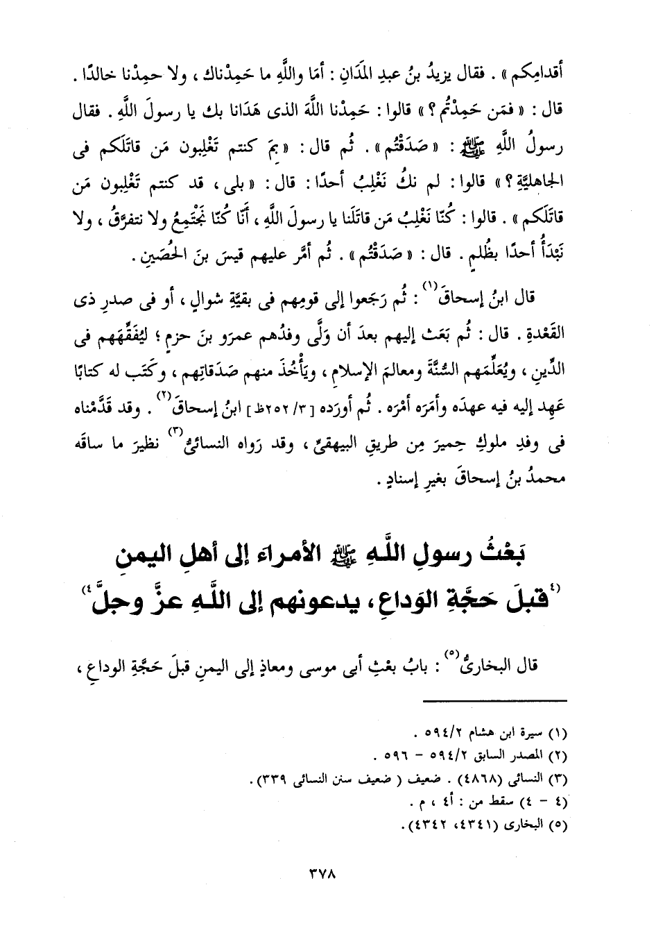أَقْدَامِكُمْ ". فَقَالَ يَزِيدُ بْنُ عَبْدِ الْمَدَانِ: أَمَا وَاللَّهِ مَا حَمِدْنَاكَ وَلَا حَمِدْنَا خَالِدًا قَالَ: " فَمَنْ حَمِدْتُمْ؟ " قَالُوا: حَمِدْنَا اللَّهَ الَّذِي هَدَانَا بِكَ يَا رَسُولَ اللَّهِ. فَقَالَ رَسُولُ اللَّهِ صَلَّى اللَّهُ عَلَيْهِ وَسَلَّمَ: " صَدَقْتُمْ ". ثُمَّ قَالَ: " بِمَ كُنْتُمْ تَغْلِبُونَ مَنْ قَاتَلَكُمْ فِي الْجَاهِلِيَّةِ؟ ". قَالُوا: لَمْ نَكُ نَغْلِبُ أَحَدًا: قَالَ: " بَلَى، قَدْ كُنْتُمْ تَغْلِبُونَ مَنْ قَاتَلَكُمْ ". قَالُوا: كُنَّا نَغْلِبُ مَنْ قَاتَلَنَا يَا رَسُولَ اللَّهِ، أَنَّا كُنَّا نَجْتَمِعُ وَلَا نَتَفَرَّقُ، وَلَا نَبْدَأُ أَحَدًا بِظُلْمٍ، قَالَ: " صَدَقْتُمْ " ثُمَّ أَمَّرَ عَلَيْهِمْ قَيْسَ بْنَ الْحُصَيْنِ.»
