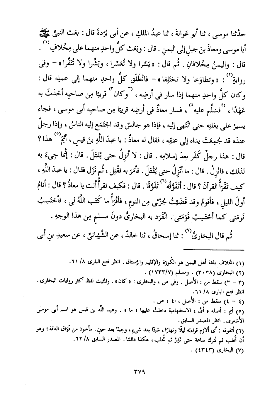 حَدَّثَنَا مُوسَى، ثَنَا أَبُو عَوَانَةَ، ثَنَا عَبْدُ الْمَلِكِ، عَنْ أَبِي بُرْدَةَ قَالَ: «بَعَثَ النَّبِيُّ صَلَّى اللَّهُ عَلَيْهِ وَسَلَّمَ أَبَا مُوسَى وَمُعَاذَ بْنَ جَبَلٍ إِلَى الْيَمَنِ. قَالَ: وَبَعَثَ كُلَّ وَاحِدٍ مِنْهُمَا عَلَى مِخْلَافٍ. قَالَ: وَالْيَمَنُ مِخْلَافَانِ. ثُمَّ قَالَ: " يَسِّرَا وَلَا تُعَسِّرَا، وَبَشِّرَا وَلَا تُنَفِّرَا ". - وَفِي رِوَايَةٍ: " وَتَطَاوَعَا وَلَا تَخْتَلِفَا " - فَانْطَلَقَ كُلُّ وَاحِدٍ مِنْهُمَا إِلَى عَمَلِهِ قَالَ: وَكَانَ كُلُّ وَاحِدٍ مِنْهُمَا إِذَا سَارَ فِي أَرْضِهِ، وَكَانَ قَرِيبًا مِنْ صَاحِبِهِ أَحْدَثَ بِهِ عَهْدًا، فَسَلَّمَ عَلَيْهِ، فَسَارَ مُعَاذٌ فِي أَرْضِهِ قَرِيبًا مِنْ صَاحِبِهِ أَبِي مُوسَى فَجَاءَ يَسِيرُ عَلَى بَغْلَتِهِ حَتَّى انْتَهَى إِلَيْهِ، فَإِذَا هُوَ جَالِسٌ وَقَدِ اجْتَمَعَ إِلَيْهِ النَّاسُ، وَإِذَا رَجُلٌ عِنْدَهُ قَدْ جُمِعَتْ يَدَاهُ إِلَى عُنُقِهِ، فَقَالَ لَهُ مُعَاذٌ: يَا عَبْدَ اللَّهِ بْنَ قَيْسٍ، أَيُّمَ هَذَا؟ قَالَ: هَذَا رَجُلٌ كَفَرَ بَعْدَ إِسْلَامِهِ. قَالَ: لَا أَنْزِلُ حَتَّى يُقْتَلَ. قَالَ: إِنَّمَا جِيءَ بِهِ لِذَلِكَ، فَانْزِلْ. قَالَ: مَا أَنْزِلُ حَتَّى يُقْتَلَ. فَأَمَرَ بِهِ فَقُتِلَ، ثُمَّ نَزَلَ فَقَالَ: يَا عَبْدَ اللَّهِ كَيْفَ تَقْرَأُ الْقُرْآنَ؟ قَالَ: أَتَفَوَّقُهُ تَفَوُّقًا. قَالَ: فَكَيْفَ تَقْرَأُ أَنْتَ يَا مُعَاذُ؟ قَالَ: أَنَامُ أَوَّلَ اللَّيْلِ، فَأَقُومُ وَقَدْ قَضَيْتُ جُزْئِي مِنَ النَّوْمِ، فَأَقْرَأُ مَا كَتَبَ اللَّهُ لِي، فَأَحْتَسِبُ نَوْمَتِي كَمَا أَحْتَسِبُ قَوْمَتِي.» انْفَرَدَ بِهِ الْبُخَارِيُّ دُونَ مُسْلِمٍ مِنْ هَذَا الْوَجْهِ.