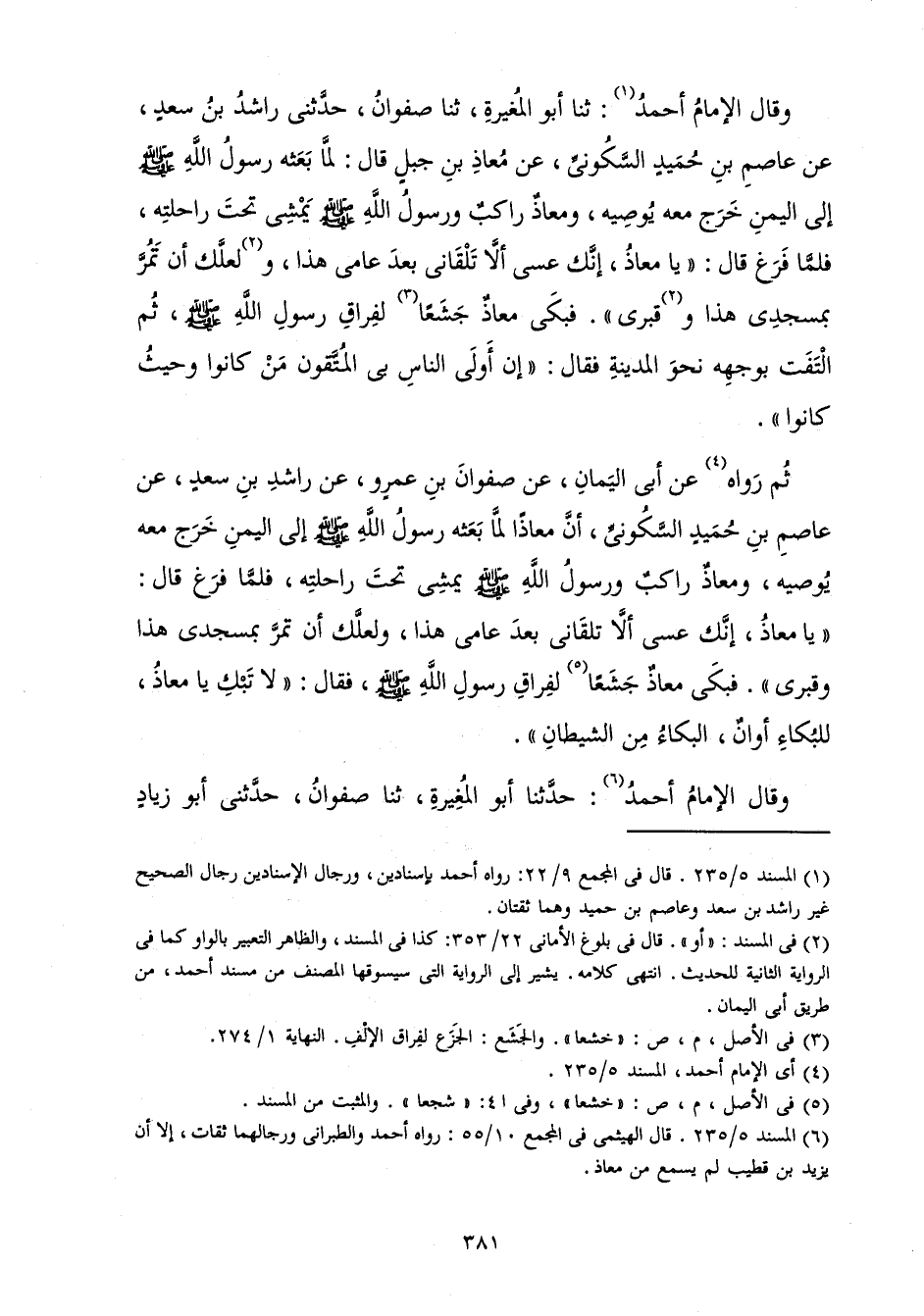 وَقَالَ الْإِمَامُ أَحْمَدُ: ثَنَا أَبُو الْمُغِيرَةِ، ثَنَا صَفْوَانُ، حَدَّثَنِي رَاشِدُ بْنُ سَعْدٍ، عَنْ عَاصِمِ بْنِ حُمَيْدٍ السَّكُونِيِّ، عَنْ مُعَاذِ بْنِ جَبَلٍ قَالَ: «لَمَّا بَعَثَهُ رَسُولُ اللَّهِ صَلَّى اللَّهُ عَلَيْهِ وَسَلَّمَ إِلَى الْيَمَنِ خَرَجَ مَعَهُ يُوصِيهِ، وَمُعَاذٌ رَاكِبٌ وَرَسُولُ اللَّهِ صَلَّى اللَّهُ عَلَيْهِ وَسَلَّمَ يَمْشِي تَحْتَ رَاحِلَتِهِ، فَلَمَّا فَرَغَ قَالَ: " يَا مُعَاذُ، إِنَّكَ عَسَى أَلَّا تَلْقَانِي بَعْدَ عَامِي هَذَا، وَلَعَلَّكَ أَنْ تَمُرَّ بِمَسْجِدِي هَذَا وَقَبْرِي ". فَبَكَى مُعَاذٌ جَشَعًا لِفِرَاقِ رَسُولِ اللَّهِ صَلَّى اللَّهُ عَلَيْهِ وَسَلَّمَ، ثُمَّ الْتَفَتَ بِوَجْهِهِ نَحْوَ الْمَدِينَةِ فَقَالَ: " إِنَّ أَوْلَى النَّاسِ بِي الْمُتَّقُونَ مَنْ كَانُوا وَحَيْثُ كَانُوا» ".