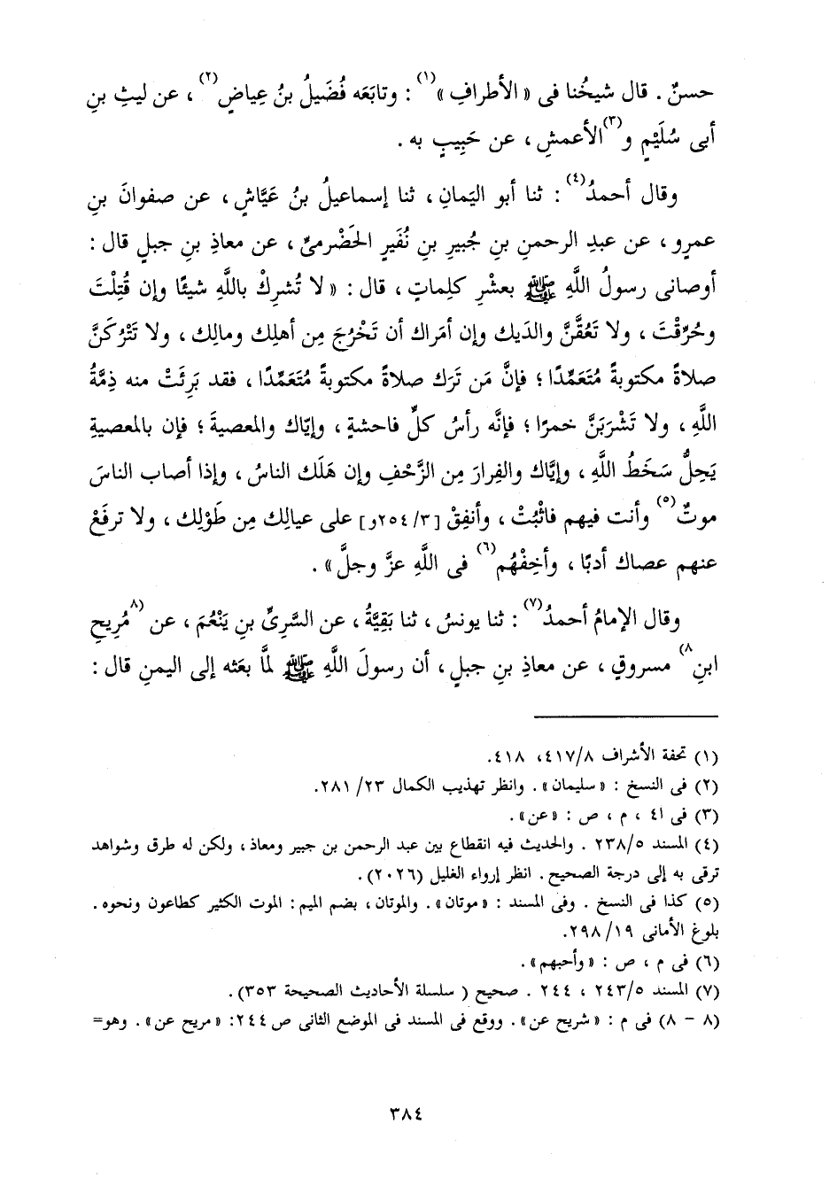وَقَالَ أَحْمَدُ: ثَنَا أَبُو الْيَمَانِ، ثَنَا إِسْمَاعِيلُ بْنُ عَيَّاشٍ، عَنْ صَفْوَانَ بْنِ عَمْرٍو، عَنْ عَبْدِ الرَّحْمَنِ بْنِ جُبَيْرِ بْنِ نُفَيْرٍ الْحَضْرَمِيِّ، عَنْ مُعَاذِ بْنِ جَبَلٍ قَالَ: «أَوْصَانِي رَسُولُ اللَّهِ صَلَّى اللَّهُ عَلَيْهِ وَسَلَّمَ بِعَشْرِ كَلِمَاتٍ قَالَ: " لَا تُشْرِكْ بِاللَّهِ شَيْئًا وَإِنْ قُتِلْتَ وَحُرِّقْتَ، وَلَا تَعُقَّنَّ وَالِدَيْكَ وَإِنْ أَمَرَاكَ أَنْ تَخْرُجَ مِنْ أَهْلِكَ وَمَالِكَ، وَلَا تَتْرُكَنَّ صَلَاةً مَكْتُوبَةً مُتَعَمِّدًا ; فَإِنَّ مَنْ تَرَكَ صَلَاةً مَكْتُوبَةً مُتَعَمِّدًا فَقَدْ بَرِئَتْ مِنْهُ ذِمَّةُ اللَّهِ، وَلَا تَشْرَبَنَّ خَمْرًا ; فَإِنَّهُ رَأَسُ كُلِّ فَاحِشَةٍ، وَإِيَّاكَ وَالْمَعْصِيَةَ ; فَإِنَّ بِالْمَعْصِيَةِ يَحِلُّ سَخَطُ اللَّهِ، وَإِيَّاكَ وَالْفِرَارَ مِنَ الزَّحْفِ وَإِنْ هَلَكَ النَّاسُ، وَإِذَا أَصَابَ النَّاسَ مَوْتٌ وَأَنْتَ فِيهِمْ فَاثْبُتْ، وَأَنْفِقْ عَلَى عِيَالِكَ مِنْ طَوْلِكَ، وَلَا تَرْفَعْ عَنْهُمْ عَصَاكَ أَدَبًا، وَأَخِفْهُمْ فِي اللَّهِ عَزَّ وَجَلَّ ".»