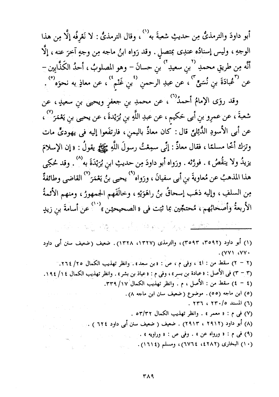 أَبُو دَاوُدَ وَالتِّرْمِذِيُّ، مِنْ حَدِيثِ شُعْبَةَ بِهِ، وَقَالَ التِّرْمِذِيُّ: لَا نَعْرِفُهُ إِلَّا مِنْ هَذَا الْوَجْهِ، وَلَيْسَ إِسْنَادُهُ عِنْدِي بِمُتَّصِلٍ. وَقَدْ رَوَاهُ ابْنُ مَاجَهْ مِنْ وَجْهٍ آخَرَ عَنْهُ، إِلَّا أَنَّهُ مِنْ طَرِيقِ مُحَمَّدِ بْنِ سَعِيدِ بْنِ حَسَّانَ - وَهُوَ الْمَصْلُوبُ أَحَدُ الْكَذَّابِينَ - عَنْ عُبَادَةَ بْنِ نُسَيٍّ، عَنْ عَبْدِ الرَّحْمَنِ بْنِ غَنْمٍ عَنْ مُعَاذٍ بِهِ نَحْوَهُ.