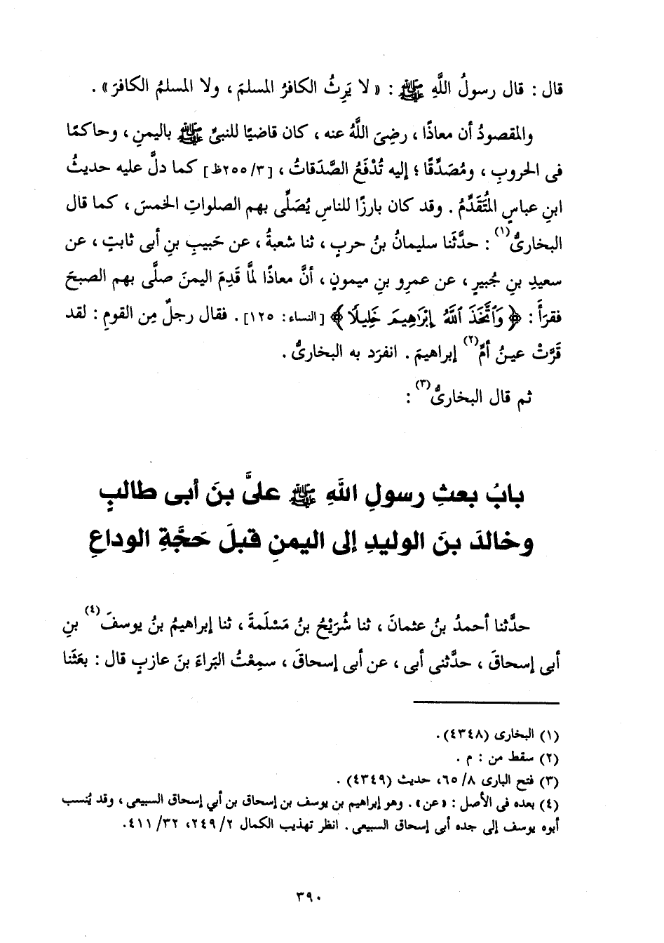 ثُمَّ قَالَ الْبُخَارِيُّ: حَدَّثَنَا أَحْمَدُ بْنُ عُثْمَانَ، ثَنَا شُرَيْحُ بْنُ مَسْلَمَةَ، ثَنَا إِبْرَاهِيمُ بْنُ يُوسُفَ بْنِ أَبِي إِسْحَاقَ، حَدَّثَنِي أَبِي، عَنْ أَبِي إِسْحَاقَ، سَمِعْتُ الْبَرَاءَ بْنَ عَازِبٍ قَالَ: «بَعَثَنَا