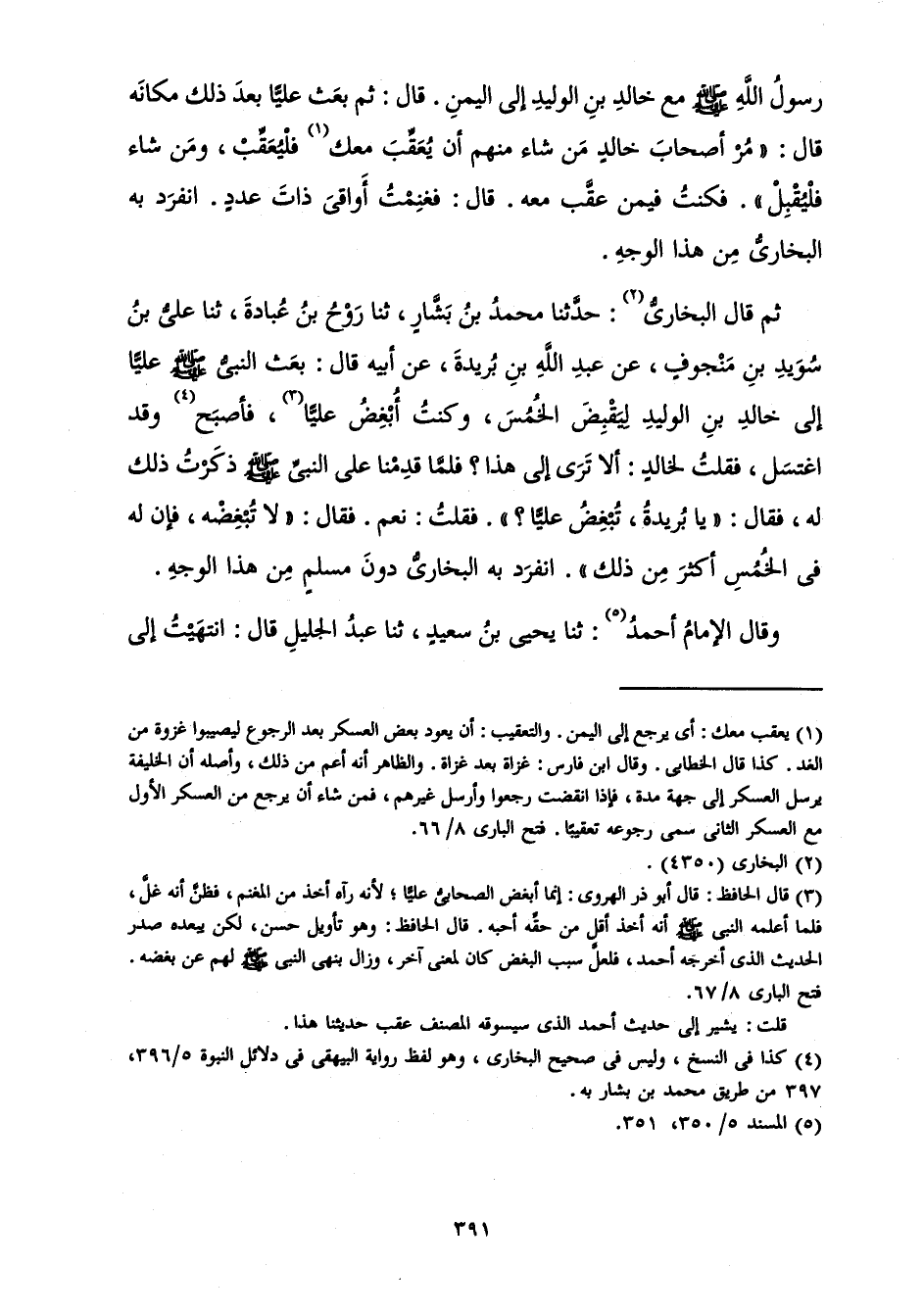 ثُمَّ قَالَ الْبُخَارِيُّ: حَدَّثَنَا مُحَمَّدُ بْنُ بَشَّارٍ، ثَنَا رُوحُ بْنُ عُبَادَةَ، ثَنَا عَلِيُّ بْنُ سُوَيْدِ بْنِ مَنْجُوفٍ، عَنْ عَبْدِ اللَّهِ بْنِ بُرَيْدَةَ، عَنْ أَبِيهِ قَالَ: «بَعَثَ النَّبِيُّ صَلَّى اللَّهُ عَلَيْهِ وَسَلَّمَ عَلِيًّا إِلَى خَالِدِ بْنِ الْوَلِيدِ لِيَقْبِضَ الْخُمُسَ، وَكُنْتُ أُبْغِضُ عَلِيًّا، فَأَصْبَحَ وَقَدِ اغْتَسَلَ، فَقُلْتُ لِخَالِدٍ: أَلَا تَرَى إِلَى هَذَا؟ فَلَمَّا قَدِمْنَا عَلَى النَّبِيِّ صَلَّى اللَّهُ عَلَيْهِ وَسَلَّمَ ذَكَرْتُ ذَلِكَ لَهُ. فَقَالَ: يَا بُرَيْدَةُ تُبْغِضُ عَلِيًّا؟ ". فَقُلْتُ: نَعَمْ. فَقَالَ: " لَا تُبْغِضْهُ فَإِنَّ لَهُ فِي الْخُمُسِ أَكْثَرَ مِنْ ذَلِكَ» انْفَرَدَ بِهِ الْبُخَارِيُّ دُونَ مُسْلِمٍ مِنْ هَذَا الْوَجْهِ.