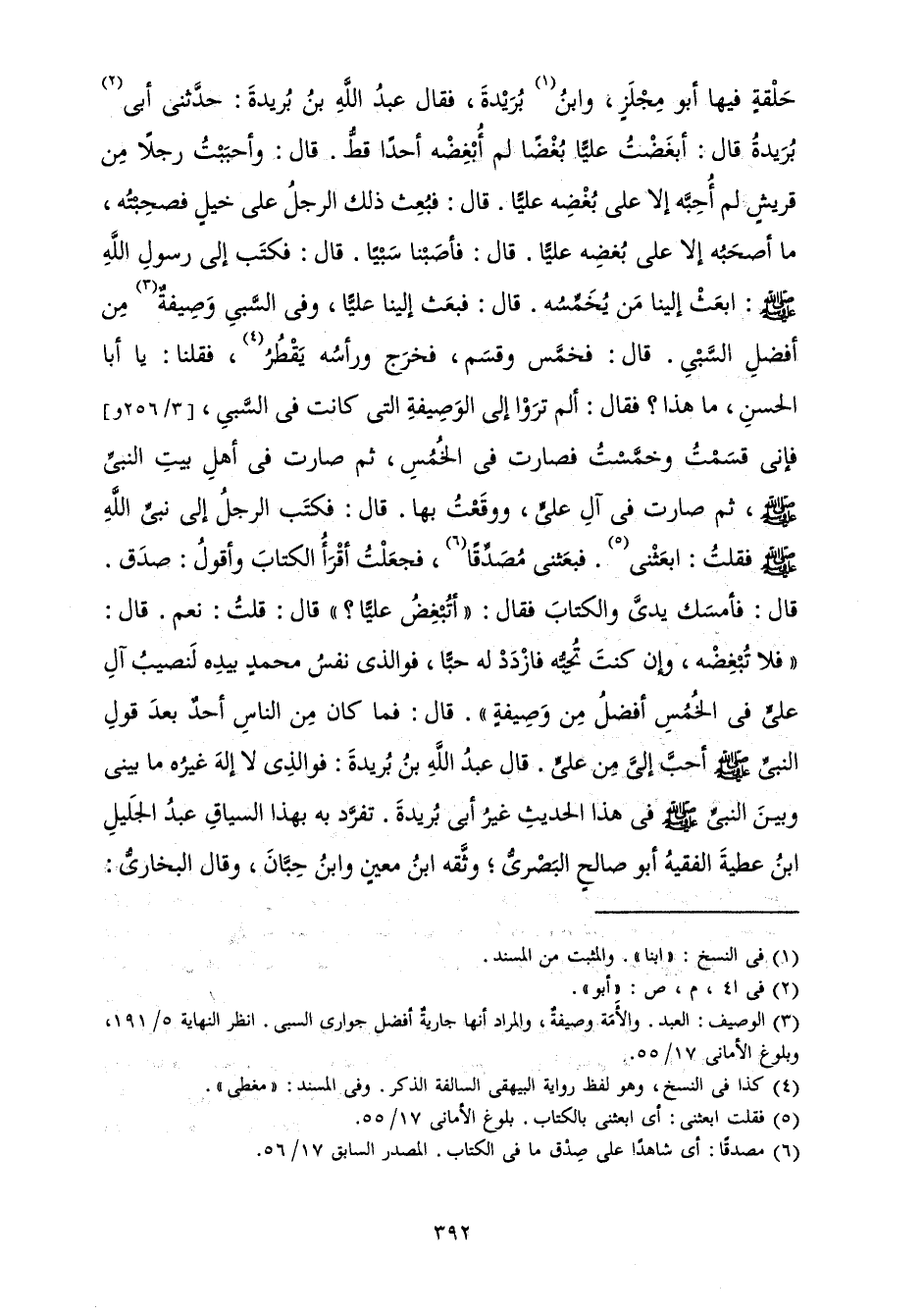 حَلْقَةٍ فِيهَا أَبُو مِجْلَزٍ، وَابْنُ بُرَيْدَةَ، فَقَالَ عَبْدُ اللَّهِ بْنُ بُرَيْدَةَ: حَدَّثَنِي أَبِي بُرَيْدَةُ قَالَ: أَبْغَضْتُ عَلِيًّا بُغْضًا لَمْ أُبْغِضْهُ أَحَدًا قَطُّ. قَالَ: وَأَحْبَبْتُ رَجُلًا مِنْ قُرَيْشٍ لَمْ أُحِبَّهُ إِلَّا عَلَى بُغْضِهِ عَلِيًّا. قَالَ: فَبُعِثَ ذَلِكَ الرَّجُلُ عَلَى خَيْلٍ فَصَحِبْتُهُ مَا أَصْحَبُهُ إِلَّا عَلَى بُغْضِهِ عَلِيًّا. قَالَ: فَأَصَبْنَا سَبْيًا. قَالَ: فَكَتَبَ إِلَى رَسُولِ اللَّهِ صَلَّى اللَّهُ عَلَيْهِ وَسَلَّمَ: ابْعَثْ إِلَيْنَا مَنْ يُخَمِّسُهُ. قَالَ: فَبَعَثَ إِلَيْنَا عَلِيًّا، وَفِي السَّبْيِ وَصِيفَةٌ مِنْ أَفْضَلِ السَّبْيِ. قَالَ: فَخَمَّسَ وَقَسَمَ، فَخَرَجَ وَرَأَسُهُ يَقْطُرُ، فَقُلْنَا: يَا أَبَا الْحَسَنِ، مَا هَذَا؟ فَقَالَ: أَلَمْ تَرَوْا إِلَى الْوَصِيفَةِ الَّتِي كَانَتْ فِي السَّبْيِ، فَإِنِّي قَسَمْتُ وَخَمَّسْتُ فَصَارَتْ فِي الْخُمُسِ، ثُمَّ صَارَتْ فِي أَهْلِ بَيْتِ النَّبِيِّ صَلَّى اللَّهُ عَلَيْهِ وَسَلَّمَ، ثُمَّ صَارَتْ فِي آلِ عَلِيٍّ، وَوَقَعْتُ بِهَا. قَالَ: فَكَتَبَ الرَّجُلُ إِلَى نَبِيِّ اللَّهِ صَلَّى اللَّهُ عَلَيْهِ وَسَلَّمَ، فَقُلْتُ: ابْعَثْنِي. فَبَعَثَنِي مُصَدِّقًا، فَجَعَلْتُ أَقْرَأُ الْكِتَابَ وَأَقُولُ: صَدَقَ. قَالَ: فَأَمْسَكَ يَدِي وَالْكِتَابَ فَقَالَ: " أَتُبْغِضُ عَلِيًّا؟ " قَالَ: قُلْتُ: نَعَمْ. قَالَ: " فَلَا تُبْغِضْهُ، وَإِنْ كُنْتَ تُحِبَّهُ فَازْدَدْ لَهُ حُبًّا، فَوَالَّذِي نَفْسُ مُحَمَّدٍ بِيَدِهِ لِنَصِيبُ آلِ عَلِيٍّ فِي الْخُمُسِ أَفْضَلُ مِنْ وَصِيفَةٍ ".» قَالَ: فَمَا كَانَ مِنَ النَّاسِ أَحَدٌ بَعْدَ قَوْلِ النَّبِيِّ صَلَّى اللَّهُ عَلَيْهِ وَسَلَّمَ أَحَبَّ إِلَيَّ مِنْ عَلِيٍّ. قَالَ عَبْدُ اللَّهِ بْنُ بُرَيْدَةَ: فَوَالَّذِي لَا إِلَهَ غَيْرُهُ مَا بَيْنِي وَبَيْنَ النَّبِيِّ صَلَّى اللَّهُ عَلَيْهِ وَسَلَّمَ فِي هَذَا الْحَدِيثِ غَيْرُ أَبِي بُرَيْدَةُ. تَفَرَّدَ بِهِ بِهَذَا السِّيَاقِ عَبْدُ الْجَلِيلِ بْنُ عَطِيَّةَ الْفَقِيهُ أَبُو صَالِحٍ الْبَصْرِيُّ ; وَثَّقَهُ ابْنُ مَعِينٍ وَابْنُ حِبَّانَ، وَقَالَ الْبُخَارِيُّ:
