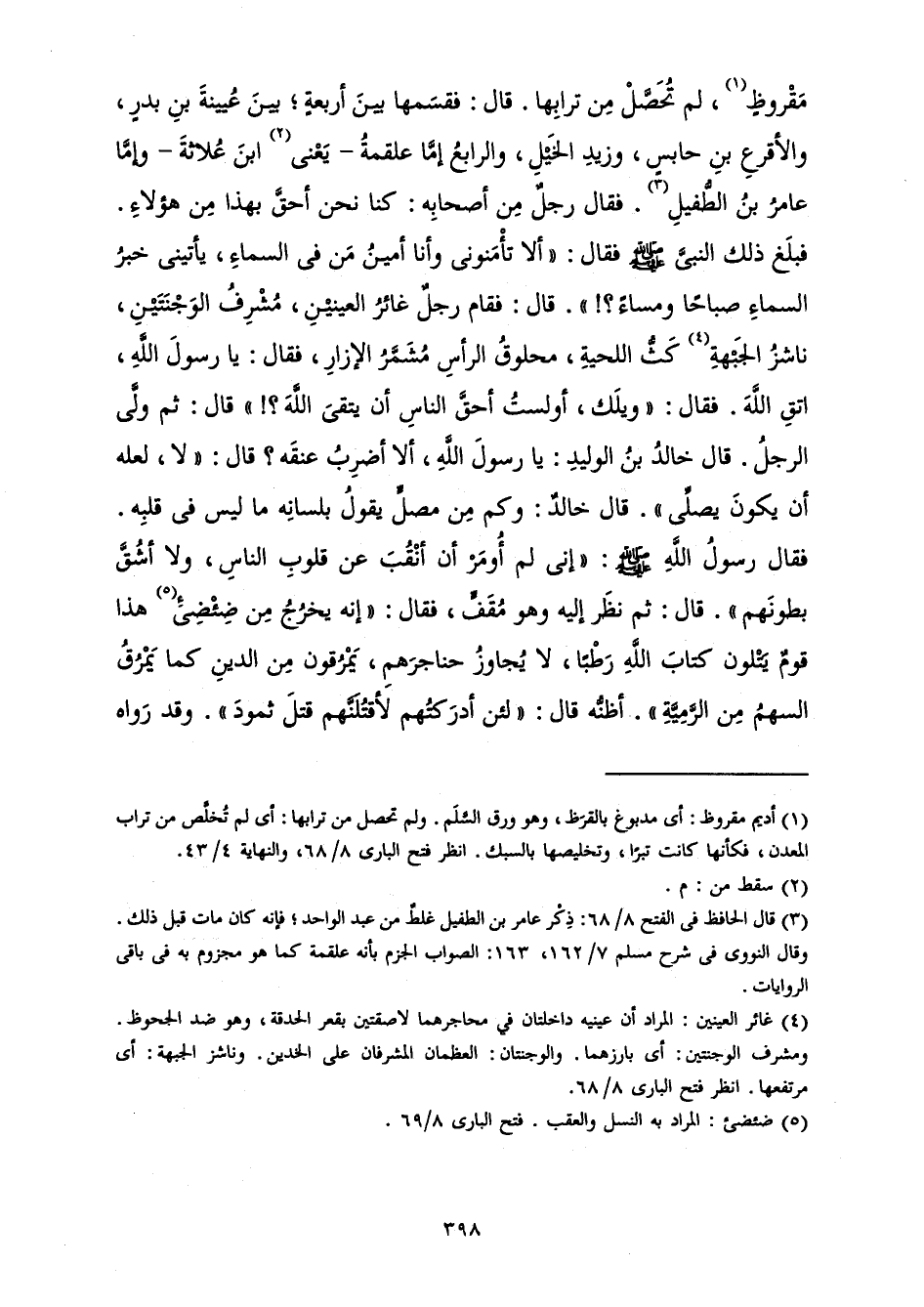مَقْرُوظٍ، لَمْ تُحَصَّلْ مِنْ تُرَابِهَا. قَالَ: فَقَسَمَهَا بَيْنَ أَرْبَعَةٍ ; بَيْنَ عُيَيْنَةَ بْنِ بَدْرٍ، وَالْأَقْرَعِ بْنِ حَابِسٍ، وَزَيْدِ الْخَيْلِ، وَالرَّابِعُ إِمَّا عَلْقَمَةُ - يَعْنِي بْنَ عُلَاثَةَ - وَإِمَّا عَامِرُ بْنُ الطُّفَيْلِ. فَقَالَ رَجُلٌ مِنْ أَصْحَابِهِ: كُنَّا نَحْنُ أَحَقُّ بِهَذَا مِنْ هَؤُلَاءِ. فَبَلَغَ ذَلِكَ النَّبِيَّ صَلَّى اللَّهُ عَلَيْهِ وَسَلَّمَ فَقَالَ: " أَلَا تَأْمَنُونِي وَأَنَا أَمِينُ مَنْ فِي السَّمَاءِ، يَأْتِينِي خَبَرُ السَّمَاءِ صَبَاحًا وَمَسَاءً؟! ". قَالَ: فَقَامَ رَجُلٌ غَائِرُ الْعَيْنَيْنِ، مُشْرِفُ الْوَجْنَتَيْنِ، نَاشِزُ الْجَبْهَةِ، كَثُّ اللِّحْيَةِ، مَحْلُوقُ الرَّأْسِ، مُشَمَّرُ الْإِزَارِ، فَقَالَ: يَا رَسُولَ اللَّهِ، اتَّقِ اللَّهَ. فَقَالَ: " وَيْلَكَ، أَوَلَسْتُ أَحَقَّ النَّاسِ أَنْ يَتَّقِيَ اللَّهَ؟! ". قَالَ: ثُمَّ وَلَّى الرَّجُلُ. قَالَ خَالِدُ بْنُ الْوَلِيدِ: يَا رَسُولَ اللَّهِ، أَلَا أَضْرِبُ عُنُقَهُ؟ قَالَ: " لَا، لَعَلَّهُ أَنْ يَكُونَ يُصَلِّي ". قَالَ خَالِدٌ: وَكَمْ مِنْ مُصَلٍّ يَقُولُ بِلِسَانِهِ مَا لَيْسَ فِي قَلْبِهِ. فَقَالَ رَسُولُ اللَّهِ صَلَّى اللَّهُ عَلَيْهِ وَسَلَّمَ: " إِنِّي لَمْ أُؤْمَرُ أَنْ أُنَقِّبَ عَنْ قُلُوبِ النَّاسِ، وَلَا أَشُقَّ بُطُونَهُمْ ". قَالَ: ثُمَّ نَظَرَ إِلَيْهِ وَهُوَ مُقْفٍ، فَقَالَ: " إِنَّهُ يَخْرُجُ مِنْ ضِئْضِئِ هَذَا قَوْمٌ يَتْلُونَ كِتَابَ اللَّهِ رَطْبًا لَا يُجَاوِزُ حَنَاجِرَهُمْ، يَمْرُقُونَ مِنَ الدِّينِ كَمَا يَمْرُقُ السَّهْمُ مِنَ الرَّمِيَّةِ ". أَظُنُّهُ قَالَ: " لَئِنْ أَدْرَكْتُهُمْ لَأَقْتُلَنَّهُمْ قَتْلَ ثَمُودَ ".» وَقَدْ رَوَاهُ
