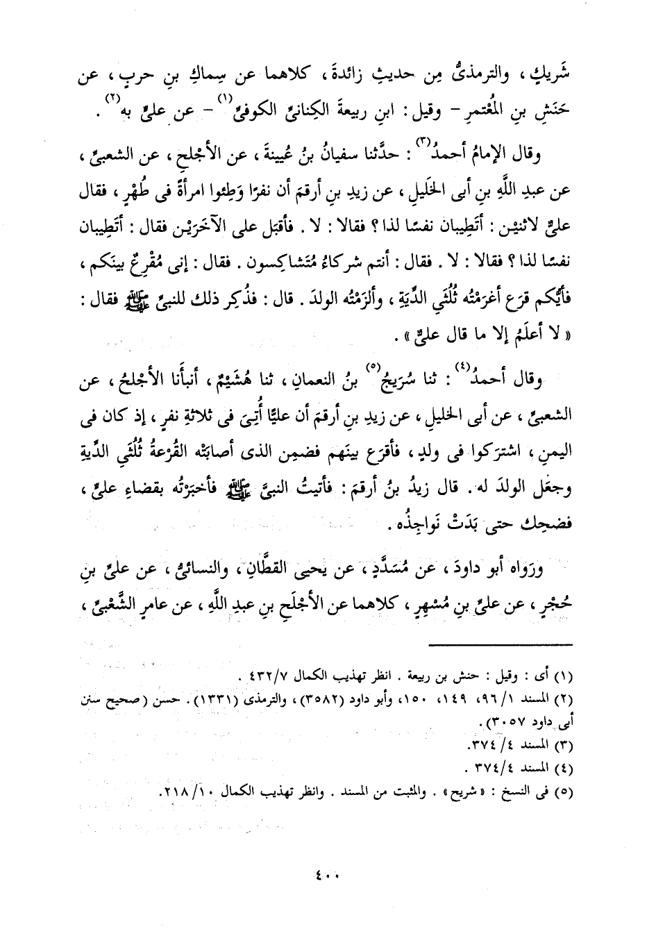 وَقَالَ أَحْمَدُ: ثَنَا سُرَيْجُ بْنُ النُّعْمَانِ، ثَنَا هُشَيْمٌ، أَنْبَأَنَا الْأَجْلَحُ، عَنِ الشَّعْبِيِّ، عَنْ أَبِي الْخَلِيلِ، «عَنْ زَيْدِ بْنِ أَرْقَمَ أَنَّ عَلِيًّا أُتِيَ فِي ثَلَاثَةِ نَفَرٍ، إِذْ كَانَ فِي الْيَمَنِ، اشْتَرَكُوا فِي وَلَدٍ، فَأَقْرَعَ بَيْنَهُمْ فَضَمِنَ الَّذِي أَصَابَتْهُ الْقُرْعَةُ ثُلْثَيِ الدِّيَةِ وَجَعَلَ الْوَلَدَ لَهُ. قَالَ زَيْدُ بْنُ أَرْقَمَ: فَأَتَيْتُ النَّبِيَّ صَلَّى اللَّهُ عَلَيْهِ وَسَلَّمَ فَأَخْبَرْتُهُ بِقَضَاءِ عَلِيٍّ، فَضَحِكَ حَتَّى بَدَتْ نَوَاجِذُهُ.»