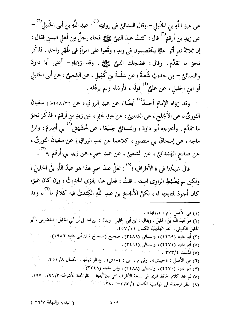 عَنْ عَبْدِ اللَّهِ بْنِ الْخَلِيلِ - وَقَالَ النَّسَائِيُّ فِي رِوَايَتِهِ: عَبْدِ اللَّهِ بْنِ أَبِي الْخَلِيلِ - عَنْ زَيْدِ بْنِ أَرْقَمَ قَالَ: «كُنْتُ عِنْدَ النَّبِيِّ صَلَّى اللَّهُ عَلَيْهِ وَسَلَّمَ فَجَاءَ رَجُلٌ مِنْ أَهْلِ الْيَمَنِ فَقَالَ: إِنَّ ثَلَاثَةَ نَفَرٍ أَتَوْا عَلِيًّا يَخْتَصِمُونَ فِي وَلَدٍ، وَقَعُوا عَلَى امْرَأَةٍ فِي طُهْرٍ وَاحِدٍ. فَذَكَرَ نَحْوَ مَا تَقَدَّمَ. وَقَالَ: فَضَحِكَ النَّبِيُّ صَلَّى اللَّهُ عَلَيْهِ وَسَلَّمَ.» وَقَدْ رَوَيَاهُ - أَعْنِي أَبَا دَاوُدَ وَالنَّسَائِيَّ - مِنْ حَدِيثِ شُعْبَةَ، عَنْ سَلَمَةَ بْنِ كُهَيْلٍ، عَنِ الشَّعْبِيِّ، عَنْ أَبِي الْخَلِيلِ أَوِ ابْنِ الْخَلِيلِ، عَنْ عَلِيٍّ قَوْلَهُ فَأَرْسَلَهُ وَلَمْ يَرْفَعْهُ.