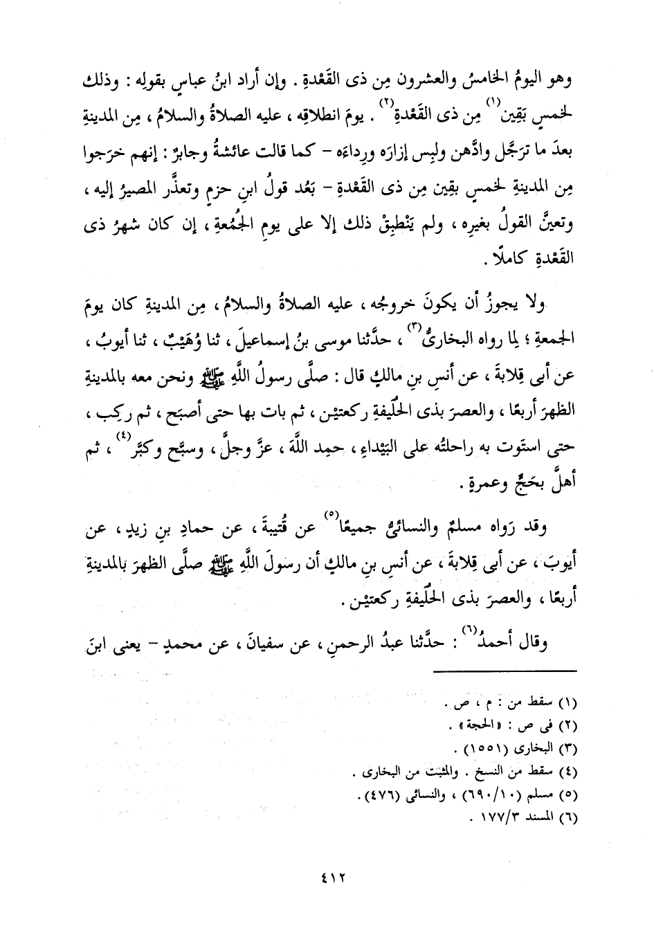 وَلَا يَجُوزُ أَنْ يَكُونَ خُرُوجُهُ، عَلَيْهِ الصَّلَاةُ وَالسَّلَامُ، مِنَ الْمَدِينَةِ كَانَ يَوْمَ الْجُمُعَةِ ; لِمَا رَوَاهُ الْبُخَارِيُّ، حَدَّثَنَا مُوسَى بْنُ إِسْمَاعِيلَ، ثَنَا وُهَيْبٌ، ثَنَا أَيُّوبُ، عَنْ أَبِي قِلَابَةَ، عَنْ أَنَسِ بْنِ مَالِكٍ قَالَ: «صَلَّى رَسُولُ اللَّهِ صَلَّى اللَّهُ عَلَيْهِ وَسَلَّمَ وَنَحْنُ مَعَهُ بِالْمَدِينَةِ الظُّهْرَ أَرْبَعًا، وَالْعَصْرَ بِذِي الْحُلَيْفَةِ رَكْعَتَيْنِ، ثُمَّ بَاتَ بِهَا حَتَّى أَصْبَحَ، ثُمَّ رَكِبَ، حَتَّى اسْتَوَتْ بِهِ رَاحِلَتُهُ عَلَى الْبَيْدَاءِ، حَمِدَ اللَّهَ، عَزَّ وَجَلَّ، وَسَبَّحَ وَكَبَّرَ، ثُمَّ أَهَلَّ بِحَجٍّ وَعُمْرَةٍ»