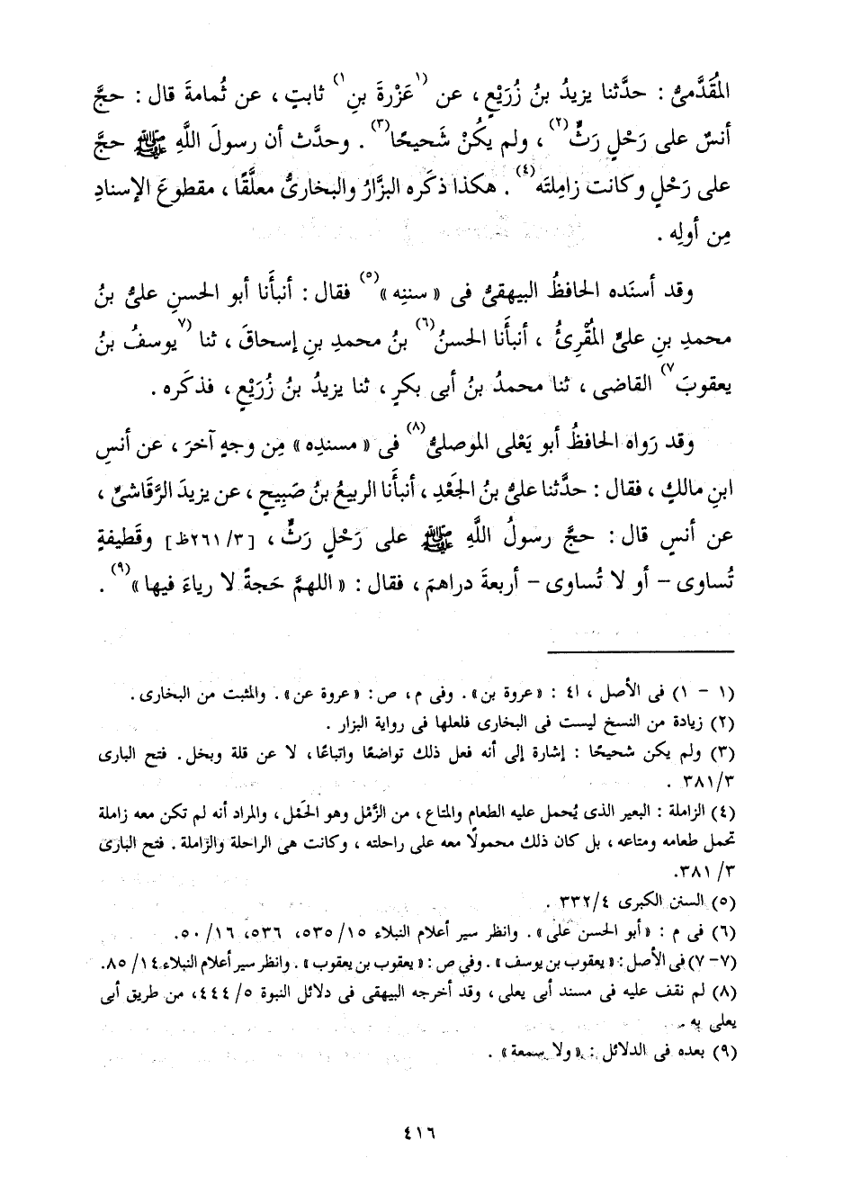 الْمُقَدَّمِيُّ: حَدَّثَنَا يَزِيدُ بْنُ زُرَيْعٍ، عَنْ عَزْرَةَ بْنِ ثَابِتٍ، عَنْ ثُمَامَةَ قَالَ: «حَجَّ أَنَسٌ عَلَى رَحْلٍ رَثٍّ، وَلَمْ يَكُنْ شَحِيحًا. وَحَدَّثَ أَنَّ رَسُولَ اللَّهِ صَلَّى اللَّهُ عَلَيْهِ وَسَلَّمَ حَجَّ عَلَى رَحْلٍ وَكَانَتْ زَامِلَتَهُ.» هَكَذَا ذَكَرَهُ الْبَزَّارُ وَالْبُخَارِيُّ مُعَلَّقًا، مَقْطُوعَ الْإِسْنَادِ مِنْ أَوَّلِهِ.