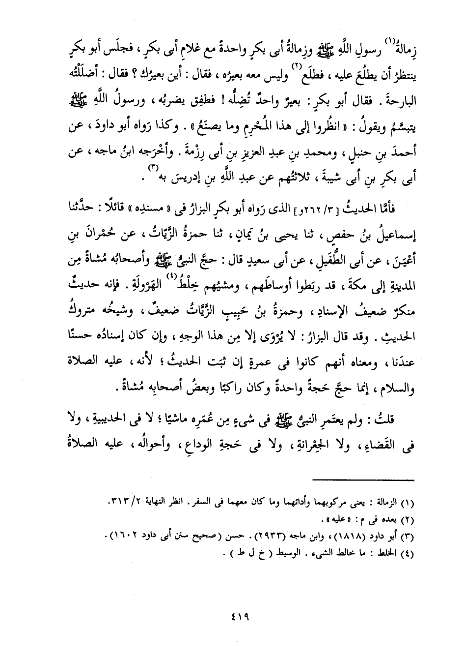 زِمَالَةُ رَسُولِ اللَّهِ صَلَّى اللَّهُ عَلَيْهِ وَسَلَّمَ وَزِمَالَةُ أَبِي بَكْرٍ وَاحِدَةً مَعَ غُلَامِ أَبِي بَكْرٍ، فَجَلَسَ أَبُو بَكْرٍ يَنْتَظِرُ أَنْ يَطْلُعَ عَلَيْهِ فَطَلَعَ وَلَيْسَ مَعَهُ بَعِيرُهُ، فَقَالَ: أَيْنَ بَعِيرُكَ. فَقَالَ: أَضْلَلْتُهُ الْبَارِحَةَ. فَقَالَ أَبُو بَكْرٍ: بَعِيرٌ وَاحِدٌ تُضِلُّهُ! فَطَفِقَ يَضْرِبُهُ، وَرَسُولُ اللَّهِ صَلَّى اللَّهُ عَلَيْهِ وَسَلَّمَ يَبْتَسِمُ وَيَقُولُ: " انْظُرُوا إِلَى هَذَا الْمُحْرِمِ وَمَا يَصْنَعُ ".» وَكَذَا رَوَاهُ أَبُو دَاوُدَ، عَنْ أَحْمَدَ بْنِ حَنْبَلٍ، وَمُحَمَّدِ بْنِ عَبْدِ الْعَزِيزِ بْنِ أَبِي رِزْمَةَ. وَأَخْرَجَهُ ابْنُ مَاجَهْ، عَنْ أَبِي بَكْرِ بْنِ أَبِي شَيْبَةَ، ثَلَاثَتُهُمْ عَنْ عَبْدِ اللَّهِ بْنِ إِدْرِيسَ بِهِ.