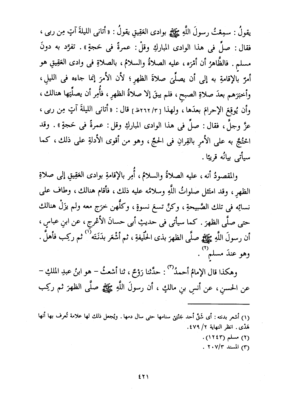 يَقُولُ: «سَمِعْتُ رَسُولَ اللَّهِ صَلَّى اللَّهُ عَلَيْهِ وَسَلَّمَ بِوَادِي الْعَقِيقِ يَقُولُ: " أَتَانِي اللَّيْلَةَ آتٍ مِنْ رَبِّي، فَقَالَ: صَلِّ فِي هَذَا الْوَادِي الْمُبَارَكِ وَقُلْ: عُمْرَةً فِي حَجَّةٍ» ". تَفَرَّدَ بِهِ دُونَ مُسْلِمٍ. فَالظَّاهِرُ أَنَّهُ أَمَرَهُ عَلَيْهِ، الصَّلَاةُ وَالسَّلَامُ، بِالصَّلَاةِ فِي وَادِي الْعَقِيقِ هُوَ أَمْرٌ بِالْإِقَامَةِ بِهِ إِلَى أَنْ يُصَلِّيَ صَلَاةَ الظُّهْرِ ; لِأَنَّ الْأَمْرَ إِنَّمَا جَاءَهُ فِي اللَّيْلِ، وَأَخْبَرَهُمْ بَعْدَ صَلَاةِ الصُّبْحِ، فَلَمْ يَبْقَ إِلَّا صَلَاةُ الظُّهْرِ، فَأُمِرَ أَنْ يُصَلِّيَهَا هُنَالِكَ، وَأَنْ يُوقِعَ الْإِحْرَامَ بَعْدَهَا، وَلِهَذَا قَالَ: " أَتَانِي اللَّيْلَةَ آتٍ مِنْ رَبِّي عَزَّ وَجَلَّ فَقَالَ: صَلِّ فِي هَذَا الْوَادِي الْمُبَارَكِ وَقُلْ: عُمْرَةً فِي حَجَّةٍ ". وَقَدِ احْتُجَّ بِهِ عَلَى الْأَمْرِ بِالْقِرَانِ فِي الْحَجِّ، وَهُوَ مِنْ أَقْوَى الْأَدِلَّةِ عَلَى ذَلِكَ، كَمَا سَيَأْتِي بَيَانُهُ قَرِيبًا.
