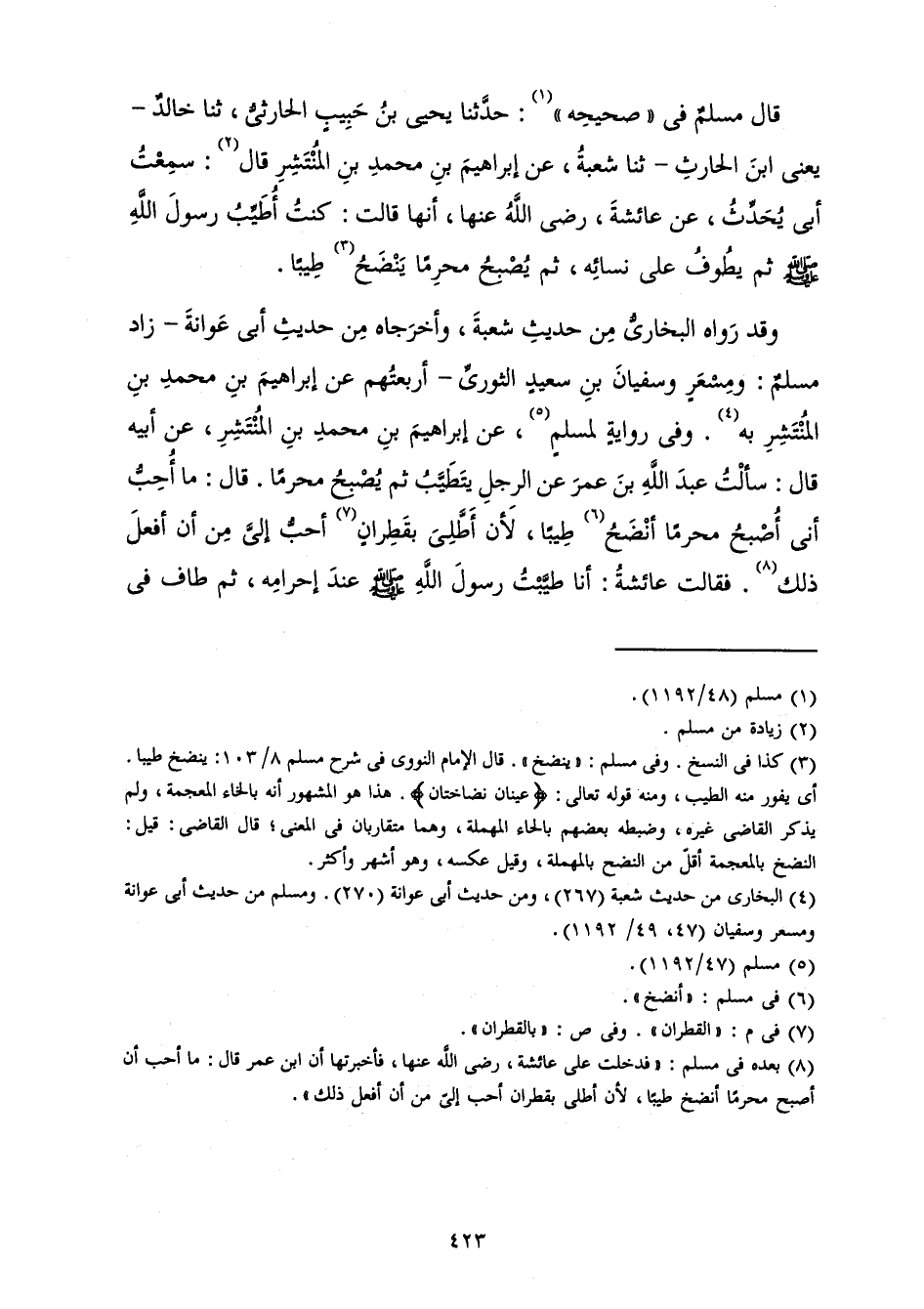قَالَ مُسْلِمٌ فِي " صَحِيحِهِ ": حَدَّثَنَا يَحْيَى بْنُ حَبِيبٍ الْحَارِثِيُّ، ثَنَا خَالِدٌ - يَعْنِي ابْنَ الْحَارِثِ - ثَنَا شُعْبَةُ، عَنْ إِبْرَاهِيمَ بْنِ مُحَمَّدِ بْنِ الْمُنْتَشِرِ قَالَ: «سَمِعْتُ أَبِي يُحَدِّثُ، عَنْ عَائِشَةَ رَضِيَ اللَّهُ عَنْهَا، أَنَّهَا قَالَتْ: كُنْتُ أُطَيِّبُ رَسُولَ اللَّهِ صَلَّى اللَّهُ عَلَيْهِ وَسَلَّمَ ثُمَّ يَطُوفُ عَلَى نِسَائِهِ، ثُمَّ يُصْبِحُ مُحْرِمًا يَنْضَحُ طِيبًا»
