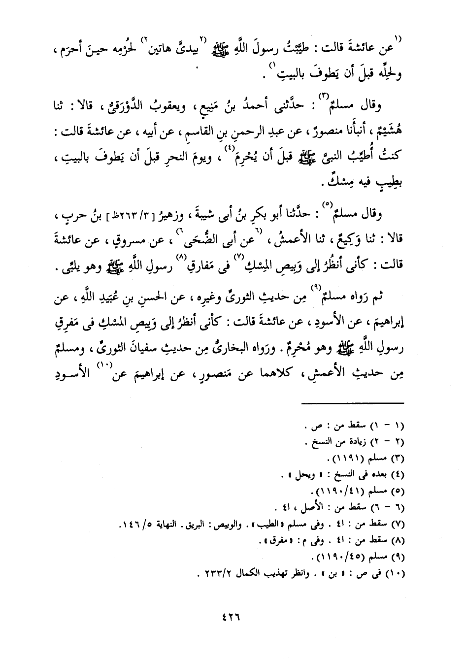 ثُمَّ رَوَاهُ مُسْلِمٌ مِنْ حَدِيثِ الثَّوْرِيِّ وَغَيْرِهِ، عَنِ الْحَسَنِ بْنِ عُبَيْدِ اللَّهِ، عَنْ إِبْرَاهِيمَ، عَنِ الْأَسْوَدِ، عَنْ عَائِشَةَ قَالَتْ: «كَأَنِّي أَنْظُرُ إِلَى وَبِيصِ الْمِسْكِ فِي مَفْرِقِ رَسُولِ اللَّهِ صَلَّى اللَّهُ عَلَيْهِ وَسَلَّمَ وَهُوَ مُحْرِمٌ.» وَرَوَاهُ الْبُخَارِيُّ مِنْ حَدِيثِ سُفْيَانَ الثَّوْرِيِّ، وَمُسْلِمٌ مِنْ حَدِيثِ الْأَعْمَشِ، كِلَاهُمَا عَنْ مَنْصُورٍ، عَنْ إِبْرَاهِيمَ، عَنِ الْأَسْوَدِ