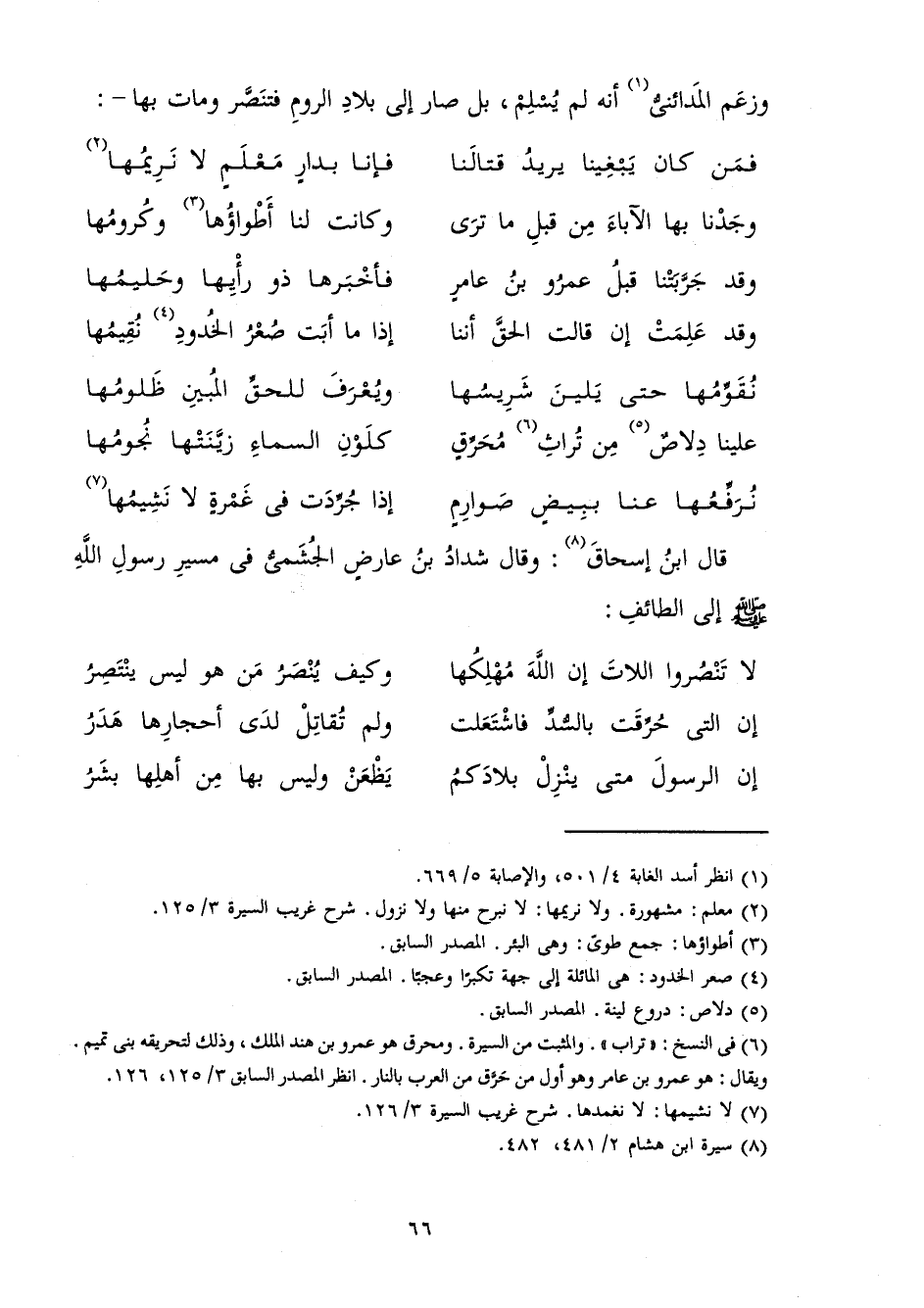 قَالَ ابْنُ إِسْحَاقَ: وَقَالَ شَدَّادُ بْنُ عَارَضٍ الْجُشَمِيُّ فِي مَسِيرِ رَسُولِ اللَّهِ صَلَّى اللَّهُ عَلَيْهِ وَسَلَّمَ إِلَى الطَّائِفِ:.