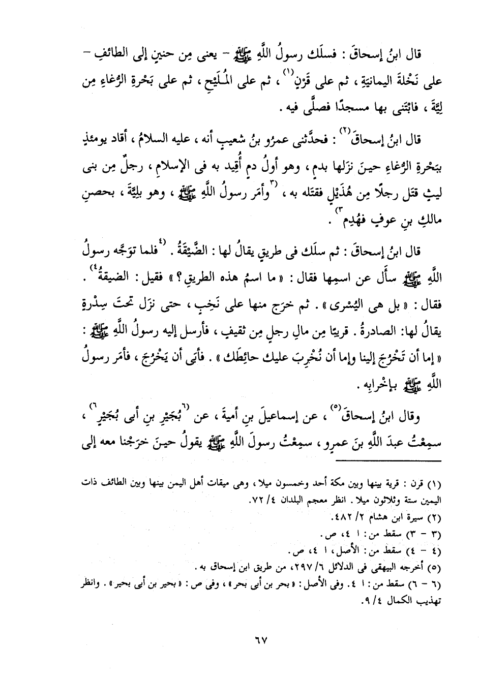 قَالَ ابْنُ إِسْحَاقَ: فَسَلَكَ رَسُولُ اللَّهِ صَلَّى اللَّهُ عَلَيْهِ وَسَلَّمَ - يَعْنِي مِنْ حُنَيْنٍ إِلَى الطَّائِفِ - عَلَى نَخْلَةَ الْيَمَانِيَّةِ، ثُمَّ عَلَى قَرْنٍ، ثُمَّ عَلَى الْمُلَيْحِ، ثُمَّ عَلَى بَحْرَةِ الرُّغَاءِ مِنْ لِيَّةَ، فَابْتَنَى بِهَا مَسْجِدًا فَصَلَّى فِيهِ.