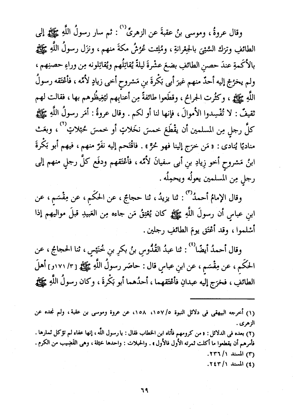 وَقَالَ الْإِمَامُ أَحْمَدُ: ثَنَا يَزِيدُ ثَنَا حَجَّاجٌ عَنِ الْحَكَمِ عَنْ مِقْسَمٍ عَنِ ابْنِ عَبَّاسٍ أَنَّ رَسُولَ اللَّهِ صَلَّى اللَّهُ عَلَيْهِ وَسَلَّمَ «كَانَ يَعْتِقُ مَنْ جَاءَهُ مِنَ الْعَبِيدِ قَبْلَ مَوَالِيهِمْ إِذَا أَسْلَمُوا، وَقَدْ أَعْتَقَ يَوْمَ الطَّائِفِ رَجُلَيْنِ.» .