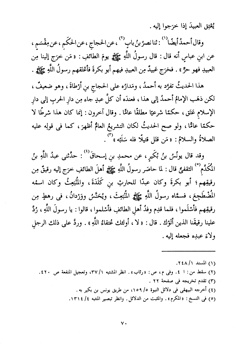 وَقَالَ أَحْمَدُ أَيْضًا: ثَنَا نَصْرُ بْنُ بَابٍ عَنِ الْحَجَّاجِ عَنِ الْحَكَمِ عَنْ مِقْسَمٍ عَنِ ابْنِ عَبَّاسٍ أَنَّهُ قَالَ: قَالَ رَسُولُ اللَّهِ صَلَّى اللَّهُ عَلَيْهِ وَسَلَّمَ يَوْمَ الطَّائِفِ: «مَنْ خَرَجَ إِلَيْنَا مِنَ الْعَبِيدِ فَهُوَ حُرٌّ ". فَخَرَجَ عَبِيدٌ مِنَ الْعَبِيدِ فِيهِمْ أَبُو بَكْرَةَ فَأَعْتَقَهُمْ رَسُولُ اللَّهِ صَلَّى اللَّهُ عَلَيْهِ وَسَلَّمَ.» .