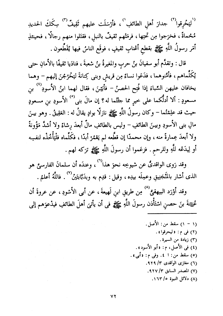 قَالَ: وَتَقَدَّمَ أَبُو سُفْيَانَ بْنُ حَرْبٍ وَالْمُغَيَّرَةُ بْنُ شُعْبَةَ فَنَادَيَا ثَقِيفًا بِالْأَمَانِ حَتَّى يُكَلِّمَاهُمْ، فَأَمَّنُوهُمَا، فَدَعَوْا نِسَاءً مِنْ قُرَيْشٍ وَبَنِي كِنَانَةَ لِيَخْرُجْنَ إِلَيْهِمْ - وَهُمَا يَخَافَانِ عَلَيْهِنَّ السِّبَاءَ إِذَا فُتِحَ الْحِصْنُ - فَأَبَيْنَ، فَقَالَ لَهُمَا ابْنُ الْأَسْوَدِ بْنُ مَسْعُودٍ: أَلَا أَدُلُّكَمَا عَلَى خَيْرٍ مِمَّا جِئْتُمَا لَهُ؟ إِنَّ مَالَ بَنِي الْأَسْوَدِ بْنِ مَسْعُودٍ حَيْثُ قَدْ عَلِمْتُمَا - وَكَانَ رَسُولُ اللَّهِ صَلَّى اللَّهُ عَلَيْهِ وَسَلَّمَ نَازِلًا بِوَادٍ يُقَالُ لَهُ: الْعَقِيقُ. وَهُوَ بَيْنَ مَالِ بَنِي الْأَسْوَدِ وَبَيْنَ الطَّائِفِ - وَلَيْسَ بِالطَّائِفِ مَالٌ أَبْعَدَ رِشَاءً وَلَا أَشَدَّ مَؤُونَةً وَلَا أَبْعَدَ عِمَارَةً مِنْهُ، وَإِنَّ مُحَمَّدًا إِنْ قَطَّعَهُ لَمْ يَعْمُرْ أَبَدًا، فَكَلِّمَاهُ فَلْيَأْخُذْهُ لِنَفْسِهِ أَوْ لِيَدَعْهُ لِلَّهِ وَلِلرَّحِمِ. فَزَعَمُوا أَنَّ رَسُولَ اللَّهِ صَلَّى اللَّهُ عَلَيْهِ وَسَلَّمَ تَرَكَهُ لَهُمْ.