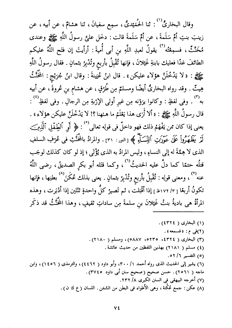 وَقَالَ الْبُخَارِيُّ: ثَنَا الْحُمَيْدِيُّ سَمِعَ سُفْيَانَ ثَنَا هِشَامٌ عَنْ أَبِيهِ، عَنْ زَيْنَبَ بِنْتِ أَمِّ سَلَمَةَ، عَنْ أُمِّ سَلَمَةَ قَالَتْ: «دَخَلَ عَلَيَّ رَسُولُ اللَّهِ صَلَّى اللَّهُ عَلَيْهِ وَسَلَّمَ وَعِنْدِي مُخَنَّثٌ، فَسَمِعْتُهُ يَقُولُ لِعَبْدِ اللَّهِ بْنِ أَبِي أُمَيَّةَ: أَرَأَيْتَ إِنْ فَتَحَ اللَّهُ عَلَيْكُمُ الطَّائِفَ غَدًا فَعَلَيْكَ بِابْنَةِ غَيْلَانَ، فَإِنَّهَا تُقْبِلُ بِأَرْبَعٍ وَتُدْبِرُ بِثَمَانٍ. فَقَالَ رَسُولُ اللَّهِ صَلَّى اللَّهُ عَلَيْهِ وَسَلَّمَ: " لَا يَدْخُلَنَّ هَؤُلَاءِ عَلَيْكُنَّ» قَالَ ابْنُ عُيَيْنَةَ: وَقَالَ ابْنُ جُرَيْجٍ: الْمُخَنَّثُ هِيتٌ. وَقَدْ رَوَاهُ الْبُخَارِيُّ أَيْضًا وَمُسْلِمٌ مِنْ طُرُقٍ، عَنْ هِشَامِ بْنِ عُرْوَةَ عَنْ أَبِيهِ بِهِ. وَفِي لَفْظٍ: وَكَانُوا يَرَوْنَهُ مِنْ غَيْرِ أُولِي الْإِرْبَةِ مِنَ الرِّجَالِ. وَفِي لَفْظٍ: قَالَ رَسُولُ اللَّهِ صَلَّى اللَّهُ عَلَيْهِ وَسَلَّمَ: «أَلَا أَرَى هَذَا يَعْلَمُ مَا هَاهُنَا؟! لَا يَدْخُلَنَّ عَلَيْكُنَّ هَؤُلَاءِ ".» يَعْنِي إِذَا كَانَ مِمَّنْ يَفْهَمُ ذَلِكَ فَهُوَ دَاخِلٌ فِي قَوْلِهِ تَعَالَى: {أَوِ الطِّفْلِ الَّذِينَ لَمْ يَظْهَرُوا عَلَى عَوْرَاتِ النِّسَاءِ} [النور: 31] وَالْمُرَادُ بِالْمُخَنَّثِ فِي عُرْفِ السَّلَفِ الَّذِي لَا هِمَّةَ لَهُ إِلَى النِّسَاءِ، وَلَيْسَ الْمُرَادُ بِهِ الَّذِي يُؤْتَى; إِذْ لَوْ كَانَ كَذَلِكَ لَوَجَبَ قَتْلُهُ حَتْمًا كَمَا دَلَّ عَلَيْهِ الْحَدِيثُ، وَكَمَا قَتَلَهُ أَبُو بَكْرٍ الصِّدِّيقُ رَضِيَ اللَّهُ عَنْهُ، وَمَعْنَى قَوْلِهِ: تُقْبِلُ بِأَرْبَعٍ وَتُدْبِرُ بِثَمَانٍ. يَعْنِي بِذَلِكَ عُكَنَ بَطْنِهَا، فَإِنَّهَا تَكُونُ أَرْبَعًا إِذَا أَقْبَلَتْ، ثُمَّ تَصِيرُ كُلُّ وَاحِدَةٍ ثِنْتَيْنِ إِذَا أَدْبَرَتْ، وَهَذِهِ الْمَرْأَةُ هِيَ بَادِيَةُ بِنْتُ غَيْلَانَ بْنِ سَلَمَةَ مِنْ سَادَاتِ ثَقِيفٍ، وَهَذَا الْمُخَنَّثُ قَدْ ذَكَرَ الْبُخَارِيُّ عَنِ ابْنِ جُرَيْجٍ أَنَّ اسْمَهُ هِيتٌ وَهَذَا هُوَ الْمَشْهُورُ.