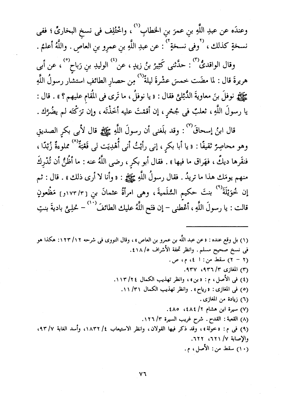 قَالَ ابْنُ إِسْحَاقَ: وَقَدْ بَلَغَنِي «أَنَّ رَسُولَ اللَّهِ صَلَّى اللَّهُ عَلَيْهِ وَسَلَّمَ قَالَ لِأَبِي بَكْرٍ الصِّدِّيقِ وَهُوَ مُحَاصِرٌ ثَقِيفًا: " يَا أَبَا بَكْرٍ إِنِّي رَأَيْتُ أَنِّي أُهْدِيَتْ لِي قَعْبَةٌ مَمْلُوءَةٌ زُبْدًا فَنَقَرَهَا دِيكٌ، فَهَرَاقَ مَا فِيهَا " فَقَالَ أَبُو بَكْرٍ رَضِيَ اللَّهُ عَنْهُ: مَا أَظُنُّ أَنْ تُدْرِكَ مِنْهُمْ يَوْمَكَ هَذَا مَا تُرِيدُ. فَقَالَ رَسُولُ اللَّهِ صَلَّى اللَّهُ عَلَيْهِ وَسَلَّمَ: " وَأَنَا لَا أَرَى ذَلِكَ ".» قَالَ: ثُمَّ «إِنَّ خَوْلَةَ بِنْتَ حَكِيمٍ السُّلَمِيَّةَ، وَهِيَ امْرَأَةُ عُثْمَانَ بْنِ مَظْعُونٍ قَالَتْ: يَا رَسُولَ اللَّهِ، أَعْطِنِي - إِنْ فَتَحَ اللَّهُ عَلَيْكَ الطَّائِفَ - حُلِيَّ بَادِيَةَ بِنْتِ غَيْلَانَ بْنِ سَلَمَةَ، أَوْ حُلِيَّ الْفَارِعَةِ بِنْتِ عَقِيلٍ، وَكَانَتَا مِنْ أَحْلَى نِسَاءِ ثَقِيفٍ، فَذُكِرَ لِي أَنَّ رَسُولَ اللَّهِ صَلَّى اللَّهُ عَلَيْهِ وَسَلَّمَ قَالَ لَهَا: " وَإِنْ كَانَ لَمْ يُؤْذَنْ فِي ثَقِيفٍ يَا خُوَيْلَةُ؟ ". فَخَرَجَتْ خُوَيْلَةُ فَذَكَرَتْ ذَلِكَ لِعُمَرَ بْنِ الْخَطَّابِ فَدَخَلَ عَلَى رَسُولِ اللَّهِ صَلَّى اللَّهُ عَلَيْهِ وَسَلَّمَ فَقَالَ: يَا رَسُولَ اللَّهِ مَا حَدِيثٌ حَدَّثَتْنِيهُ خُوَيْلَةُ زَعَمَتْ أَنَّكَ قُلْتَهُ؟ قَالَ: " قَدْ قُلْتُهُ ". قَالَ: أَوَ مَا أُذِنَ فِيهِمْ؟ قَالَ: " لَا ". قَالَ: أَفَلَا أُؤَذِّنُ بِالرَّحِيلِ؟ قَالَ: " بَلَى ". فَأَذَّنَ عُمَرُ بِالرَّحِيلِ، فَلَمَّا اسْتَقَلَّ النَّاسُ نَادَى سَعِيدُ بْنُ عُبَيْدِ بْنِ أَسِيدِ بْنِ أَبِي عَمْرِو بْنِ عِلَاجٍ: أَلَا إِنَّ الْحَيَّ مُقِيمٌ. قَالَ: يَقُولُ عُيَيْنَةُ بْنُ حِصْنٍ: أَجَلْ، وَاللَّهِ مَجَدَةً كِرَامًا. فَقَالَ لَهُ رَجُلٌ مِنَ الْمُسْلِمِينَ: قَاتَلَكَ اللَّهُ يَا عُيَيْنَةُ أَتَمْدَحُ الْمُشْرِكِينَ بِالِامْتِنَاعِ مِنْ رَسُولِ اللَّهِ صَلَّى اللَّهُ عَلَيْهِ وَسَلَّمَ وَقَدْ جِئْتَ تَنْصُرُهُ؟ فَقَالَ: إِنِّي وَاللَّهِ مَا جِئْتُ لِأُقَاتِلَ ثَقِيفًا مَعَكُمْ، وَلَكِنِّي أَرَدْتُ أَنْ يَفْتَحَ مُحَمَّدٌ الطَّائِفَ فَأُصِيبَ مِنْ ثَقِيفٍ جَارِيَةً أَطَؤُهَا، لَعَلَّهَا تَلِدُ لِي رَجُلًا، فَإِنَّ ثَقِيفًا مَنَاكِيرُ.» .