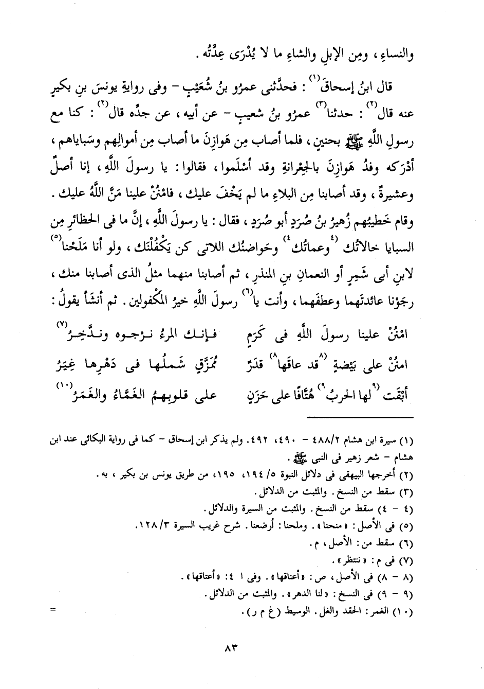 قَالَ ابْنُ إِسْحَاقَ: فَحَدَّثَنِي عَمْرُو بْنُ شُعَيْبٍ - وَفِي رِوَايَةِ يُونُسَ بْنِ بُكَيْرٍ عَنْهُ قَالَ: حَدَّثَنَا عَمْرُو بْنُ شُعَيْبٍ - عَنْ أَبِيهِ، عَنْ جَدِّهِ قَالَ: «كُنَّا مَعَ رَسُولِ اللَّهِ صَلَّى اللَّهُ عَلَيْهِ وَسَلَّمَ بِحُنَيْنٍ، فَلَمَّا أَصَابَ مِنْ هَوَازِنَ مَا أَصَابَ مِنْ أَمْوَالِهِمْ وَسَبَايَاهُمْ، أَدْرَكَهُ وَفْدُ هَوَازِنَ بِالْجِعْرَانَةِ وَقَدْ أَسْلَمُوا، فَقَالُوا: يَا رَسُولَ اللَّهِ، إِنَّا أَصْلٌ وَعَشِيرَةٌ، وَقَدْ أَصَابَنَا مِنَ الْبَلَاءِ مَا لَمْ يَخْفَ عَلَيْكَ، فَامْنُنْ عَلَيْنَا مَنَّ اللَّهُ عَلَيْكَ. وَقَامَ خَطِيبُهُمْ زُهَيْرُ بْنُ صُرَدٍ أَبُو صُرَدٍ، فَقَالَ: يَا رَسُولَ اللَّهِ، إِنَّ مَا فِي الْحَظَائِرِ مِنِ السَّبَايَا خَالَاتُكَ وَعَمَّاتُكَ وَحَوَاضِنُكَ اللَّاتِي كُنَّ يَكْفُلْنَكَ، وَلَوْ أَنَّا مَلَحْنَا لِابْنِ أَبِي شَمِرٍ أَوِ النُّعْمَانِ بْنِ الْمُنْذِرِ، ثُمَّ أَصَابَنَا مِنْهُمَا مِثْلُ الَّذِي أَصَابَنَا مِنْكَ، رَجَوْنَا عَائِدَتَهُمَا وَعَطْفَهُمَا، وَأَنْتَ يَا رَسُولَ اللَّهِ خَيْرُ الْمَكْفُولِينَ. ثُمَّ أَنْشَأَ يَقُولُ: