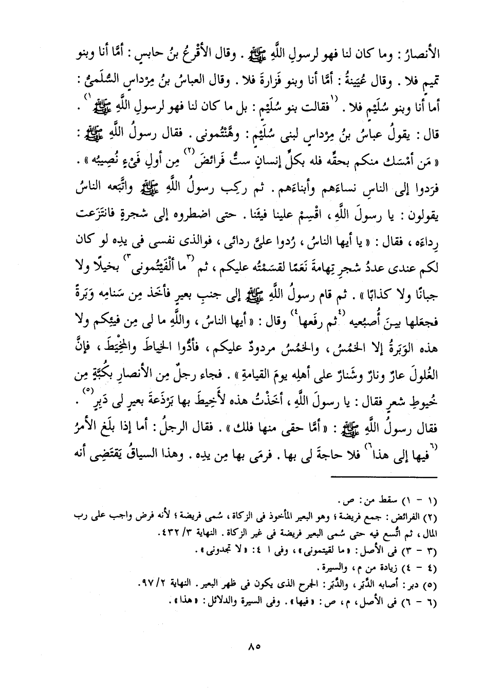 الْأَنْصَارُ: وَمَا كَانَ لَنَا فَهُوَ لِرَسُولِ اللَّهِ صَلَّى اللَّهُ عَلَيْهِ وَسَلَّمَ. وَقَالَ الْأَقْرَعُ بْنُ حَابِسٍ أَمَّا أَنَا وَبَنُو تَمِيمٍ فَلَا. وَقَالَ عُيَيْنَةُ: أَمَّا أَنَا وَبَنُو فَزَارَةَ فَلَا. وَقَالَ الْعَبَّاسُ بْنُ مِرْدَاسٍ السُّلَمِيُّ: أَمَّا أَنَا وَبَنُو سُلَيْمٍ فَلَا. فَقَالَتْ بَنُو سُلَيْمٍ: بَلْ مَا كَانَ لَنَا فَهُوَ لِرَسُولِ اللَّهِ صَلَّى اللَّهُ عَلَيْهِ وَسَلَّمَ. قَالَ: يَقُولُ عَبَّاسُ بْنُ مِرْدَاسٍ لِبَنِي سُلَيْمٍ: وَهَّنْتُمُونِي. فَقَالَ رَسُولُ اللَّهِ صَلَّى اللَّهُ عَلَيْهِ وَسَلَّمَ: " مَنْ أَمْسَكَ مِنْكُمْ بِحَقِّهِ فَلَهُ بِكُلِّ إِنْسَانٍ سِتُّ فَرَائِضَ مِنْ أَوَّلِ فَيْءٍ نُصِيبُهُ ". فَرَدُّوا إِلَى النَّاسِ نِسَاءَهُمْ وَأَبْنَاءَهُمْ. ثُمَّ رَكِبَ رَسُولُ اللَّهِ صَلَّى اللَّهُ عَلَيْهِ وَسَلَّمَ وَاتَّبَعَهُ النَّاسُ يَقُولُونَ: يَا رَسُولَ اللَّهِ، اقْسِمْ عَلَيْنَا فَيْئَنَا. حَتَّى اضْطَرُّوهُ إِلَى شَجَرَةٍ فَانْتَزَعَتْ رِدَاءَهُ، فَقَالَ: " يَا أَيُّهَا النَّاسُ، رَدُّوا عَلَيَّ رِدَائِي، فَوَالَّذِي نَفْسِي فِي يَدِهِ لَوْ كَانَ لَكُمْ عِنْدِي عَدَدُ شَجَرِ تِهَامَةَ نَعَمًا لَقَسَمْتُهُ عَلَيْكُمْ، ثُمَّ مَا أَلْفَيْتُمُونِي بَخِيلًا وَلَا جَبَانًا وَلَا كَذَّابًا ". ثُمَّ قَامَ رَسُولُ اللَّهِ صَلَّى اللَّهُ عَلَيْهِ وَسَلَّمَ إِلَى جَنْبِ بِعِيرٍ فَأَخَذَ مِنْ سَنَامِهِ وَبَرَةً فَجَعَلَهَا بَيْنَ أُصْبُعَيْهِ ثُمَّ رَفَعَهَا وَقَالَ: " أَيُّهَا النَّاسُ، وَاللَّهِ مَا لِي مِنْ فَيْئِكُمْ وَلَا هَذِهِ الْوَبَرَةِ إِلَّا الْخُمْسُ، وَالْخُمْسُ مَرْدُودٌ عَلَيْكُمْ، فَأَدَّوُا الْخِيَاطَ وَالْمَخِيطَ فَإِنَّ الْغُلُولَ عَارٌ وَنَارٌ وَشَنَارٌ عَلَى أَهْلِهِ يَوْمَ الْقِيَامَةِ ". فَجَاءَ رَجُلٌ مِنَ الْأَنْصَارِ بِكُبَّةٍ مِنْ خُيُوطِ شَعَرٍ فَقَالَ: يَا رَسُولَ اللَّهِ، أَخَذْتُ هَذِهِ لِأَخِيطَ بِهَا بَرْذَعَةَ بَعِيرٍ لِي دَبِرٍ. فَقَالَ رَسُولُ اللَّهِ صَلَّى اللَّهُ عَلَيْهِ وَسَلَّمَ: " أَمَّا حَقِّي مِنْهَا فَلَكَ ". فَقَالَ الرَّجُلُ: أَمَّا إِذَا بَلَغَ الْأَمْرُ فِيهَا إِلَى هَذَا فَلَا حَاجَةَ لِي بِهَا. فَرَمَى بِهَا مِنْ يَدِهِ.» وَهَذَا السِّيَاقُ يَقْتَضِي أَنَّهُ