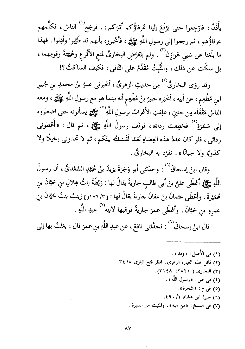 يَأْذَنْ، فَارْجِعُوا حَتَّى يَرْفَعَ إِلَيْنَا عَرْفَاؤُكُمْ أَمْرَكُمْ ". فَرَجَعَ النَّاسُ فَكَلَّمَهُمْ عَرْفَاؤُهُمْ، ثُمَّ رَجَعُوا إِلَى رَسُولِ اللَّهِ صَلَّى اللَّهُ عَلَيْهِ وَسَلَّمَ، فَأَخْبَرُوهُ بِأَنَّهُمْ قَدْ طَيَّبُوا وَأَذِنُوا.» فَهَذَا مَا بَلَغَنَا عَنْ سَبْيِ هَوَازِنَ. وَلَمْ يَتَعَرَّضِ الْبُخَارِيُّ لِمَنْعِ الْأَقْرَعِ وَعُيَيْنَةَ وَقَوْمِهِمَا، بَلْ سَكَتَ عَنْ ذَلِكَ، وَالْمُثْبِتُ مُقَدَّمٌ عَلَى النَّافِي، فَكَيْفَ السَّاكِتُ؟!