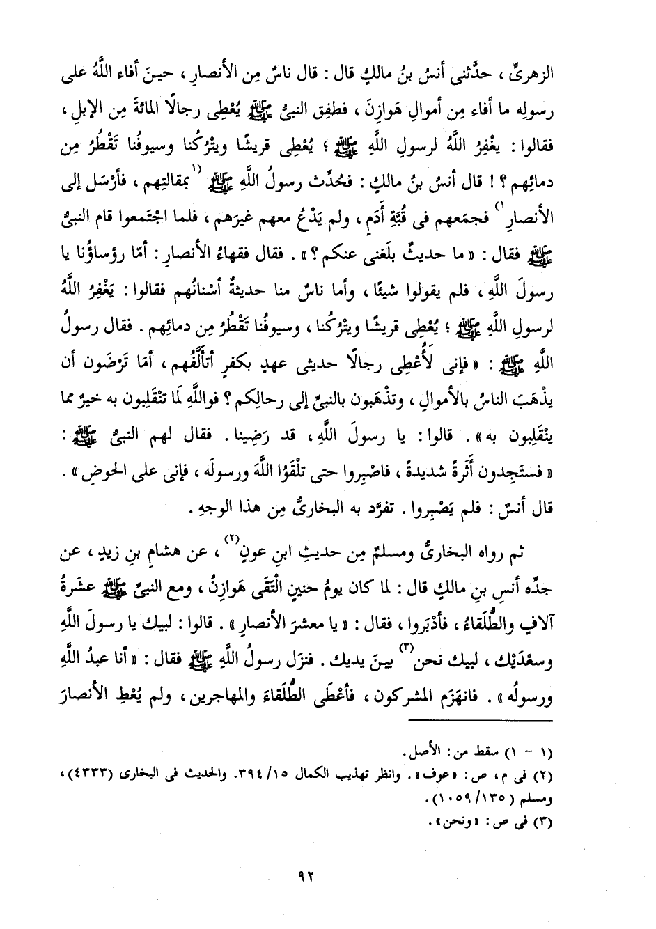 الزُّهْرِيِّ حَدَّثَنِي أَنَسُ بْنُ مَالِكٍ قَالَ: «قَالَ نَاسٌ مِنَ الْأَنْصَارِ، حِينَ أَفَاءَ اللَّهُ عَلَى رَسُولِهِ مَا أَفَاءَ مِنْ أَمْوَالِ هَوَازِنَ، فَطَفِقَ النَّبِيُّ صَلَّى اللَّهُ عَلَيْهِ وَسَلَّمَ يُعْطِي رِجَالًا الْمِائَةَ مِنَ الْإِبِلِ، فَقَالُوا: يَغْفِرُ اللَّهُ لِرَسُولِ اللَّهِ صَلَّى اللَّهُ عَلَيْهِ وَسَلَّمَ; يُعْطِي قُرَيْشًا وَيَتْرُكُنَا وَسُيُوفُنَا تَقْطُرُ مِنْ دِمَائِهِمْ؟! قَالَ أَنَسُ بْنُ مَالِكٍ: فَحُدِّثَ رَسُولُ اللَّهِ صَلَّى اللَّهُ عَلَيْهِ وَسَلَّمَ بِمَقَالَتِهِمْ، فَأَرْسَلَ إِلَى الْأَنْصَارِ فَجَمَعَهُمْ فِي قُبَّةِ أَدَمٍ، وَلَمْ يَدْعُ مَعَهُمْ غَيْرَهُمْ، فَلَمَّا اجْتَمَعُوا قَامَ النَّبِيُّ صَلَّى اللَّهُ عَلَيْهِ وَسَلَّمَ فَقَالَ: " مَا حَدِيثٌ بَلَغَنِي عَنْكُمْ؟ ". فَقَالَ فُقَهَاءُ الْأَنْصَارِ: أَمَّا رُؤَسَاؤُنَا يَا رَسُولَ اللَّهِ، فَلَمْ يَقُولُوا شَيْئًا، وَأَمَّا نَاسٌ مِنَّا حَدِيثَةٌ أَسْنَانُهُمْ فَقَالُوا: يَغْفِرُ اللَّهُ لِرَسُولِ اللَّهِ صَلَّى اللَّهُ عَلَيْهِ وَسَلَّمَ; يُعْطِي قُرَيْشًا وَيَتْرُكُنَا، وَسُيُوفُنَا تَقْطُرُ مِنْ دِمَائِهِمْ. فَقَالَ رَسُولُ اللَّهِ صَلَّى اللَّهُ عَلَيْهِ وَسَلَّمَ: " فَإِنِّي لَأُعْطِي رِجَالًا حَدِيثِي عَهِدٍ بِكُفْرٍ أَتَأَلَّفُهُمْ، أَمَا تَرْضَوْنَ أَنْ يَذْهَبَ النَّاسُ بِالْأَمْوَالِ، وَتَذْهَبُونَ بِالنَّبِيِّ إِلَى رِحَالِكُمْ؟ فَوَاللَّهِ لَمَا تَنْقَلِبُونَ بِهِ خَيْرٌ مِمَّا يَنْقَلِبُونَ بِهِ ". قَالُوا: يَا رَسُولَ اللَّهِ، قَدْ رَضِينَا. فَقَالَ لَهُمُ النَّبِيُّ صَلَّى اللَّهُ عَلَيْهِ وَسَلَّمَ: " فَسَتَجِدُونَ أَثَرَةً شَدِيدَةً، فَاصْبِرُوا حَتَّى تَلْقَوُا اللَّهَ وَرَسُولَهُ، فَإِنِّي عَلَى الْحَوْضِ ". قَالَ أُنْسٌ: فَلَمْ يَصْبِرُوا» تَفَرَّدَ بِهِ الْبُخَارِيُّ مِنْ هَذَا الْوَجْهِ.