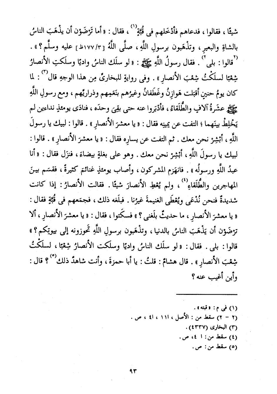 شَيْئًا، فَقَالُوا، فَدَعَاهُمْ فَأَدْخَلَهُمْ فِي قُبَّةٍ، فَقَالَ: " أَمَا تَرْضَوْنَ أَنْ يَذْهَبَ النَّاسُ بِالشَّاةِ وَالْبَعِيرِ، وَتَذْهَبُونَ بِرَسُولِ اللَّهِ، صَلَّى اللَّهُ عَلَيْهِ وَسَلَّمَ؟ ". قَالُوا: بَلَى. فَقَالَ رَسُولُ اللَّهِ صَلَّى اللَّهُ عَلَيْهِ وَسَلَّمَ: " لَوْ سَلَكَ النَّاسُ وَادِيًا وَسَلَكَتِ الْأَنْصَارُ شِعْبًا لَسَلَكْتُ شِعْبَ الْأَنْصَارِ» وَفِي رِوَايَةٍ لِلْبُخَارِيِّ مِنْ هَذَا الْوَجْهِ قَالَ: «لَمَّا كَانَ يَوْمُ حُنَيْنٍ أَقْبَلَتْ هَوَازِنُ وَغَطَفَانُ وَغَيْرُهُمْ بِنِعَمِهِمْ وَذَرَارِيِّهِمْ، وَمَعَ رَسُولِ اللَّهِ صَلَّى اللَّهُ عَلَيْهِ وَسَلَّمَ عَشَرَةُ آلَافٍ وَالطُّلَقَاءُ، فَأَدْبَرُوا عَنْهُ حَتَّى بَقِيَ وَحْدَهُ، فَنَادَى يَوْمَئِذٍ نِدَاءَيْنِ لَمْ يَخْلِطْ بَيْنَهُمَا; الْتَفَتَ عَنْ يَمِينِهِ فَقَالَ: " يَا مَعْشَرَ الْأَنْصَارِ ". قَالُوا: لَبَّيْكَ يَا رَسُولَ اللَّهِ، أَبْشِرْ نَحْنُ مَعَكَ. ثُمَّ الْتَفَتَ عَنْ يَسَارِهِ فَقَالَ: " يَا مَعْشَرَ الْأَنْصَارِ ". قَالُوا: لَبَّيْكَ يَا رَسُولَ اللَّهِ، أَبْشِرْ نَحْنُ مَعَكَ. وَهُوَ عَلَى بَغْلَةٍ بَيْضَاءَ، فَنَزَلَ فَقَالَ: " أَنَا عَبْدُ اللَّهِ وَرَسُولُهُ ". فَانْهَزَمَ الْمُشْرِكُونَ، وَأَصَابَ يَوْمَئِذٍ غَنَائِمَ كَثِيرَةً، فَقَسَّمَ بَيْنَ الْمُهَاجِرِينَ وَالطُّلَقَاءِ، وَلَمْ يُعْطِ الْأَنْصَارَ شَيْئًا. فَقَالَتِ الْأَنْصَارُ: إِذَا كَانَتْ شَدِيدَةٌ فَنَحْنُ نُدْعَى وَيُعْطَى الْغَنِيمَةَ غَيْرُنَا. فَبَلَغَهُ ذَلِكَ، فَجَمَعَهُمْ فِي قُبَّةٍ فَقَالَ: " يَا مَعْشَرَ الْأَنْصَارِ، مَا حَدِيثٌ بَلَغَنِي؟ " فَسَكَتُوا، فَقَالَ: " يَا مَعْشَرَ الْأَنْصَارِ، أَلَا تَرْضَوْنَ أَنْ يَذْهَبَ النَّاسُ بِالدُّنْيَا، وَتَذْهَبُونَ بِرَسُولِ اللَّهِ تَحُوزُونَهُ إِلَى بُيُوتِكُمْ؟ " قَالُوا: بَلَى. فَقَالَ: " لَوْ سَلَكَ النَّاسُ وَادِيًا وَسَلَكَتِ الْأَنْصَارُ شِعْبًا، لَسَلَكْتُ شِعْبَ الْأَنْصَارِ ". قَالَ هِشَامٌ: قُلْتُ: يَا أَبَا حَمْزَةَ وَأَنْتَ شَاهِدٌ ذَلِكَ؟ قَالَ: وَأَيْنَ أَغِيبُ عَنْهُ؟»