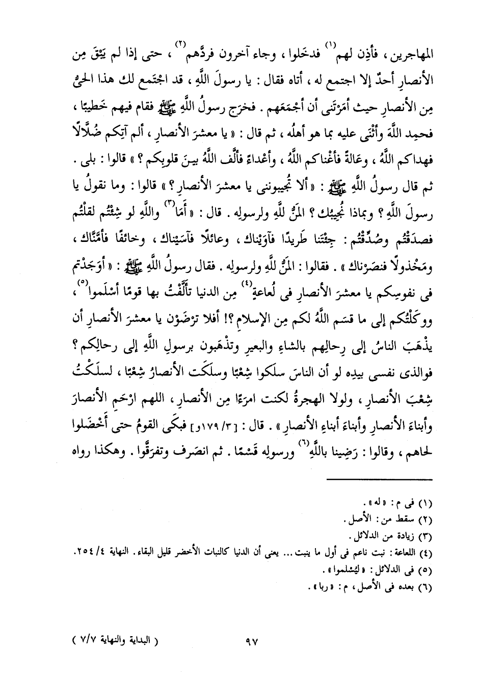 الْمُهَاجِرِينَ، فَأَذِنَ لَهُمْ فَدَخَلُوا، وَجَاءَ آخَرُونَ فَرَدَّهُمْ، حَتَّى إِذَا لَمْ يَبْقَ مِنَ الْأَنْصَارِ أَحَدٌ إِلَّا اجْتَمَعَ لَهُ، أَتَاهُ فَقَالَ: يَا رَسُولَ اللَّهِ، قَدِ اجْتَمَعَ لَكَ هَذَا الْحَيُّ مِنَ الْأَنْصَارِ حَيْثُ أَمَرْتَنِي أَنْ أَجْمَعَهُمْ. فَخَرَجَ رَسُولُ اللَّهِ صَلَّى اللَّهُ عَلَيْهِ وَسَلَّمَ فَقَامَ فِيهِمْ خَطِيبًا، فَحَمِدَ اللَّهَ وَأَثْنَى عَلَيْهِ بِمَا هُوَ أَهْلُهُ، ثُمَّ قَالَ: " يَا مَعْشَرَ الْأَنْصَارِ، أَلَمْ آتِكُمْ ضُلَّالًا فَهَدَاكُمُ اللَّهُ، وَعَالَةً فَأَغْنَاكُمُ اللَّهُ، وَأَعْدَاءً فَأَلَّفَ اللَّهُ بَيْنَ قُلُوبِكُمْ؟ " قَالُوا: بَلَى. ثُمَّ قَالَ رَسُولُ اللَّهِ صَلَّى اللَّهُ عَلَيْهِ وَسَلَّمَ: أَلَّا تُجِيبُونَنِي يَا مَعْشَرَ الْأَنْصَارِ؟ " قَالُوا: وَمَا نَقُولُ يَا رَسُولَ اللَّهِ؟ وَبِمَاذَا نُجِيبُكَ؟ الْمَنُّ لِلَّهِ وَلِرَسُولِهِ. قَالَ: " أَمَا وَاللَّهِ لَوْ شِئْتُمْ لَقُلْتُمْ فَصَدَقْتُمْ وَصُدِّقْتُمْ: جِئْتَنَا طَرِيدًا فَآوَيْنَاكَ، وَعَائِلًا فَآسَيْنَاكَ، وَخَائِفًا فَأَمَّنَّاكَ، وَمَخْذُولًا فَنَصَرْنَاكَ ". فَقَالُوا: الْمَنُّ لِلَّهِ وَلِرَسُولِهِ. فَقَالَ رَسُولُ اللَّهِ صَلَّى اللَّهُ عَلَيْهِ وَسَلَّمَ: " أَوَجَدْتُمْ فِي نُفُوسِكُمْ يَا مَعْشَرَ الْأَنْصَارِ فِي لُعَاعَةٍ مِنَ الدُّنْيَا تَأَلَّفْتُ بِهَا قَوْمًا أَسْلَمُوا، وَوَكَلْتُكُمْ إِلَى مَا قَسَمَ اللَّهُ لَكُمْ مِنَ الْإِسْلَامِ؟! أَفَلَا تَرْضَوْنَ يَا مَعْشَرَ الْأَنْصَارِ أَنْ يَذْهَبَ النَّاسُ إِلَى رِحَالِهِمْ بِالشَّاءِ وَالْبَعِيرِ وَتَذْهَبُونَ بِرَسُولِ اللَّهِ إِلَى رِحَالِكُمْ؟ فَوَالَّذِي نَفْسِي بِيَدِهِ لَوْ أَنَّ النَّاسَ سَلَكُوا شِعْبًا وَسَلَكَتِ الْأَنْصَارُ شِعْبًا، لَسَلَكْتُ شِعْبَ الْأَنْصَارِ، وَلَوْلَا الْهِجْرَةُ لَكُنْتُ امْرَأً مِنَ الْأَنْصَارِ، اللَّهُمَّ ارْحَمِ الْأَنْصَارَ وَأَبْنَاءَ الْأَنْصَارِ وَأَبْنَاءَ أَبْنَاءِ الْأَنْصَارِ ". قَالَ: فَبَكَى الْقَوْمُ حَتَّى أَخْضَلُوا لِحَاهُمْ، وَقَالُوا: رَضِينَا بِاللَّهِ وَرَسُولِهِ قَسْمًا. ثُمَّ انْصَرَفَ وَتَفَرَّقُوا» وَهَكَذَا رَوَاهُ