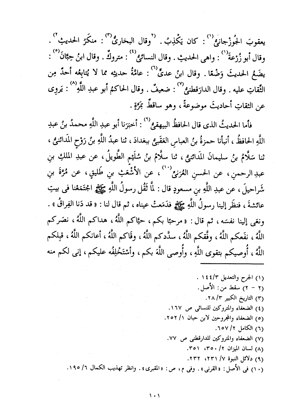 فَأَمَّا الْحَدِيثُ الَّذِي قَالَ الْحَافِظُ الْبَيْهَقِيُّ: أَخْبَرَنَا أَبُو عَبْدِ اللَّهِ مُحَمَّدُ بْنُ عَبْدِ اللَّهِ الْحَافِظُ، أَنْبَأَنَا حَمْزَةُ بْنُ الْعَبَّاسِ الْعَقِبِيُّ بِبَغْدَادَ، ثَنَا عَبْدُ اللَّهِ بْنُ رَوْحٍ الْمَدَائِنِيُّ، ثَنَا سَلَّامُ بْنُ سُلَيْمَانَ الْمَدَائِنِيُّ، ثَنَا سَلَّامُ بْنُ سُلَيْمٍ الطَّوِيلُ، عَنْ عَبْدِ الْمَلِكِ بْنِ عَبْدِ الرَّحْمَنِ، عَنِ الْحَسَنِ الْعُرَنِيُّ، عَنِ الْأَشْعَثِ بْنِ طَلِيقٍ، عَنْ مُرَّةَ بْنِ شَرَاحِيلَ، عَنْ عَبْدِ اللَّهِ بْنِ مَسْعُودٍ قَالَ: «لَمَّا ثَقُلَ رَسُولُ اللَّهِ صَلَّى اللَّهُ عَلَيْهِ وَسَلَّمَ اجْتَمَعْنَا فِي بَيْتِ عَائِشَةَ، فَنَظَرَ إِلَيْنَا رَسُولُ اللَّهِ صَلَّى اللَّهُ عَلَيْهِ وَسَلَّمَ فَدَمَعَتْ عَيْنَاهُ، ثُمَّ قَالَ لَنَا: " قَدْ دَنَا الْفِرَاقُ ". وَنَعَى إِلَيْنَا نَفْسَهُ ثُمَّ قَالَ: " مَرْحَبًا بِكُمْ، حَيَّاكُمُ اللَّهُ، هَدَاكُمُ اللَّهُ، نَصَرَكُمُ اللَّهُ، نَفَعَكُمُ اللَّهُ، وَفَّقَكُمُ اللَّهُ، سَدَّدَكُمُ اللَّهُ، وَقَاكُمُ اللَّهُ، أَعَانَكُمُ اللَّهُ، قَبِلَكُمُ اللَّهُ، أُوصِيكُمْ بِتَقْوَى اللَّهِ، وَأُوصِي اللَّهَ بِكُمْ، وَأَسْتَخْلِفُهُ عَلَيْكُمْ، إِنِّي لَكُمْ مِنْهُ