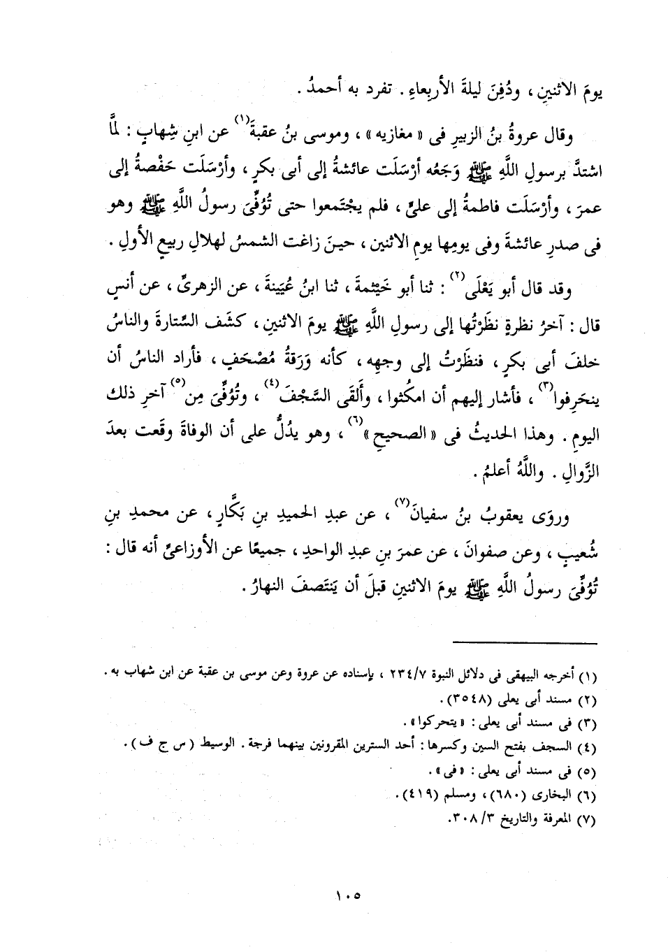 وَقَدْ قَالَ أَبُو يَعْلَى: ثَنَا أَبُو خَيْثَمَةَ، ثَنَا ابْنُ عُيَيْنَةَ، عَنِ الزُّهْرِيِّ، عَنْ أَنَسٍ قَالَ: «آخِرُ نَظْرَةٍ نَظْرَتُهَا إِلَى رَسُولِ اللَّهِ صَلَّى اللَّهُ عَلَيْهِ وَسَلَّمَ يَوْمَ الِاثْنَيْنِ، كَشَفَ السِّتَارَةَ وَالنَّاسُ خَلْفَ أَبِي بَكْرٍ، فَنَظَرْتُ إِلَى وَجْهِهِ، كَأَنَّهُ وَرَقَةُ مُصْحَفٍ، فَأَرَادَ النَّاسُ أَنْ يَنْحَرِفُوا، فَأَشَارَ إِلَيْهِمْ أَنِ امْكُثُوا، وَأَلْقَى السَّجْفَ، وَتُوُفِّيَ مِنْ آخِرِ ذَلِكَ الْيَوْمِ» . وَهَذَا الْحَدِيثُ فِي " الصَّحِيحِ "، وَهُوَ يَدُلُّ عَلَى أَنَّ الْوَفَاةَ وَقَعَتْ بَعْدَ الزَّوَالِ. وَاللَّهُ أَعْلَمُ.