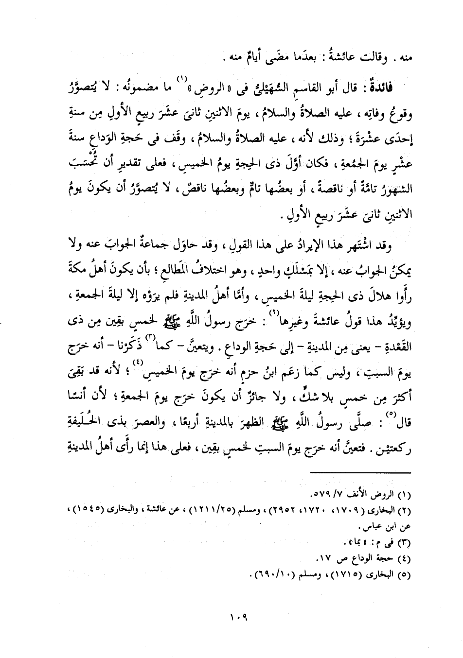 فَائِدَةٌ: قَالَ أَبُو الْقَاسِمِ السُّهَيْلِيُّ فِي " الرَّوْضِ " مَا مَضْمُونُهُ: لَا يُتَصَوَّرُ وُقُوعُ وَفَاتِهِ، عَلَيْهِ الصَّلَاةُ وَالسَّلَامُ، يَوْمَ الِاثْنَيْنِ ثَانِيَ عَشَرَ رَبِيعٍ الْأَوَّلِ مِنْ سَنَةِ إِحْدَى عَشْرَةَ ; وَذَلِكَ لِأَنَّهُ، عَلَيْهِ الصَّلَاةُ وَالسَّلَامُ، وَقَفَ فِي حَجَّةِ الْوَدَاعِ سَنَةَ عَشْرٍ يَوْمَ الْجُمُعَةِ، فَكَانَ أَوَّلَ ذِي الْحِجَّةِ يَوْمُ الْخَمِيسِ، فَعَلَى تَقْدِيرِ أَنْ تُحْسَبَ الشُّهُورُ تَامَّةً أَوْ نَاقِصَةً، أَوْ بَعْضُهَا تَامٌّ وَبَعْضُهَا نَاقِصٌ، لَا يُتَصَوَّرُ أَنْ يَكُونَ يَوْمُ الِاثْنَيْنِ ثَانِيَ عَشَرَ رَبِيعٍ الْأَوَّلِ.