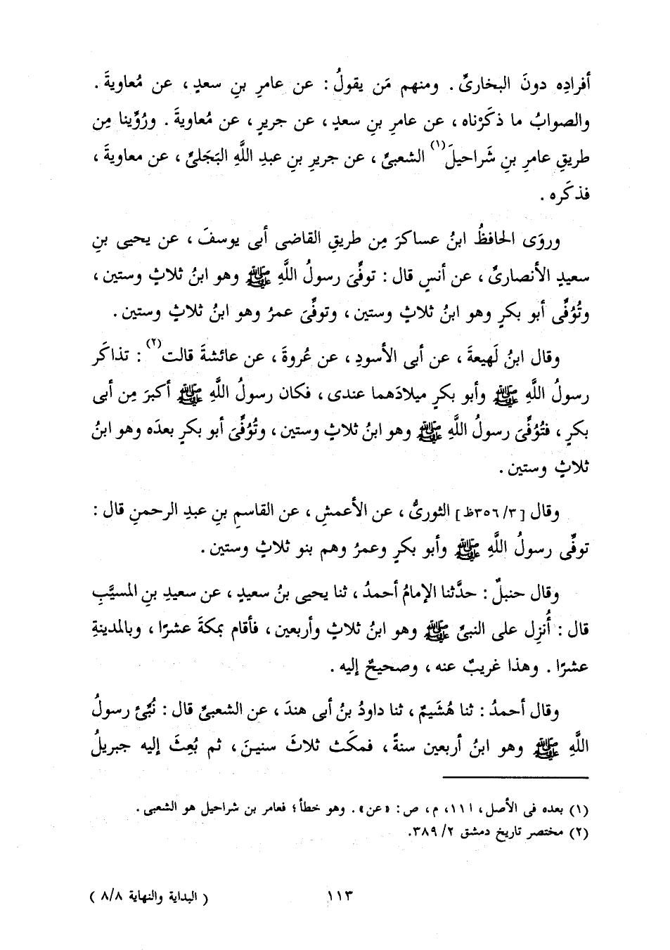 وَقَالَ الثَّوْرِيُّ، عَنِ الْأَعْمَشِ، عَنِ الْقَاسِمِ بْنِ عَبْدِ الرَّحْمَنِ قَالَ: «تُوُفِّيَ رَسُولُ اللَّهِ صَلَّى اللَّهُ عَلَيْهِ وَسَلَّمَ وَأَبُو بَكْرٍ وَعُمَرُ وَهُمْ بَنُو ثَلَاثٍ وَسِتِّينَ» .