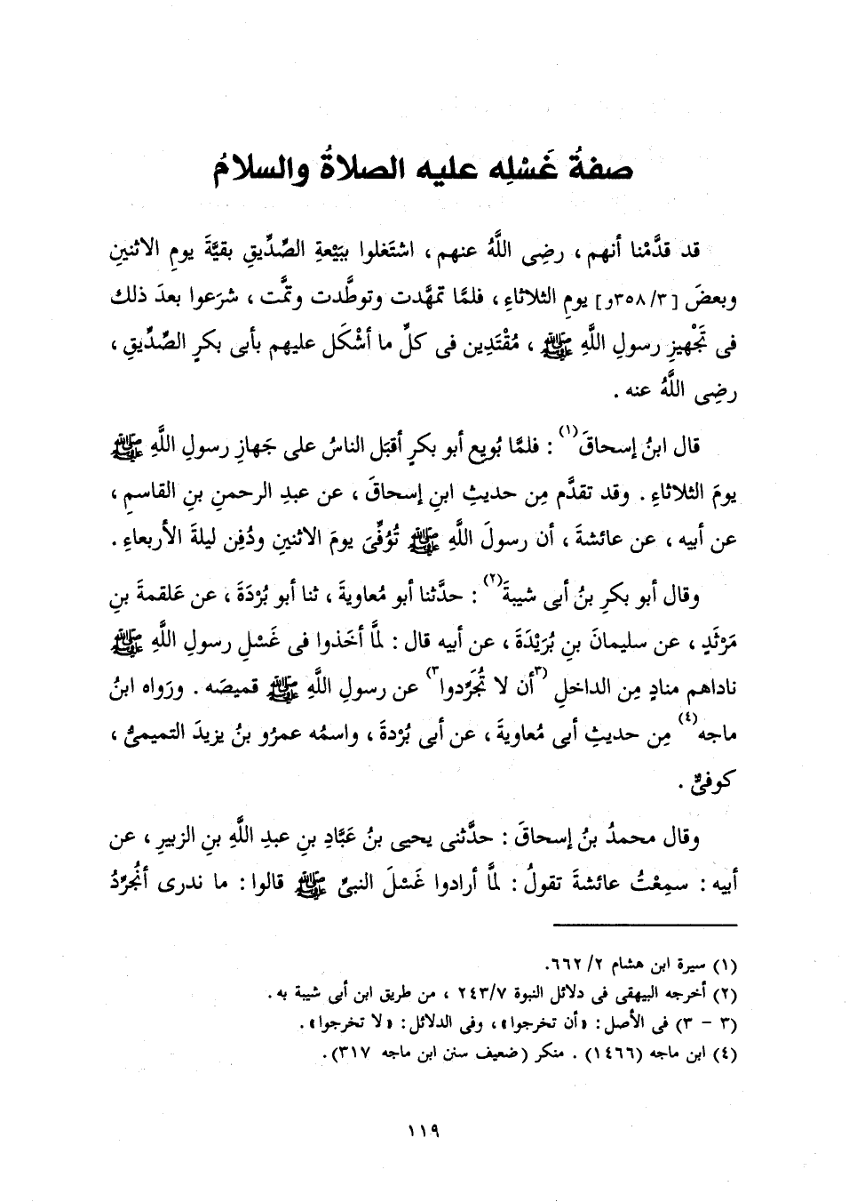 وَقَالَ أَبُو بَكْرِ بْنُ أَبِي شَيْبَةَ: حَدَّثَنَا أَبُو مُعَاوِيَةَ، ثَنَا أَبُو بُرْدَةَ، عَنْ عَلْقَمَةَ بْنِ مَرْثَدٍ، عَنْ سُلَيْمَانَ بْنِ بُرَيْدَةَ، عَنْ أَبِيهِ قَالَ: «لَمَّا أَخَذُوا فِي غَسْلِ رَسُولِ اللَّهِ صَلَّى اللَّهُ عَلَيْهِ وَسَلَّمَ نَادَاهُمْ مُنَادٍ مِنَ الدَّاخِلِ أَنْ لَا تُجَرِّدُوا عَنْ رَسُولِ اللَّهِ صَلَّى اللَّهُ عَلَيْهِ وَسَلَّمَ قَمِيصَهُ» . وَرَوَاهُ ابْنُ مَاجَهْ مِنْ حَدِيثِ أَبِي مُعَاوِيَةَ، عَنْ أَبِي بُرْدَةَ، وَاسْمُهُ عَمْرُو بْنُ يَزِيدَ التَّمِيمِيُّ، كُوفِيٌّ.