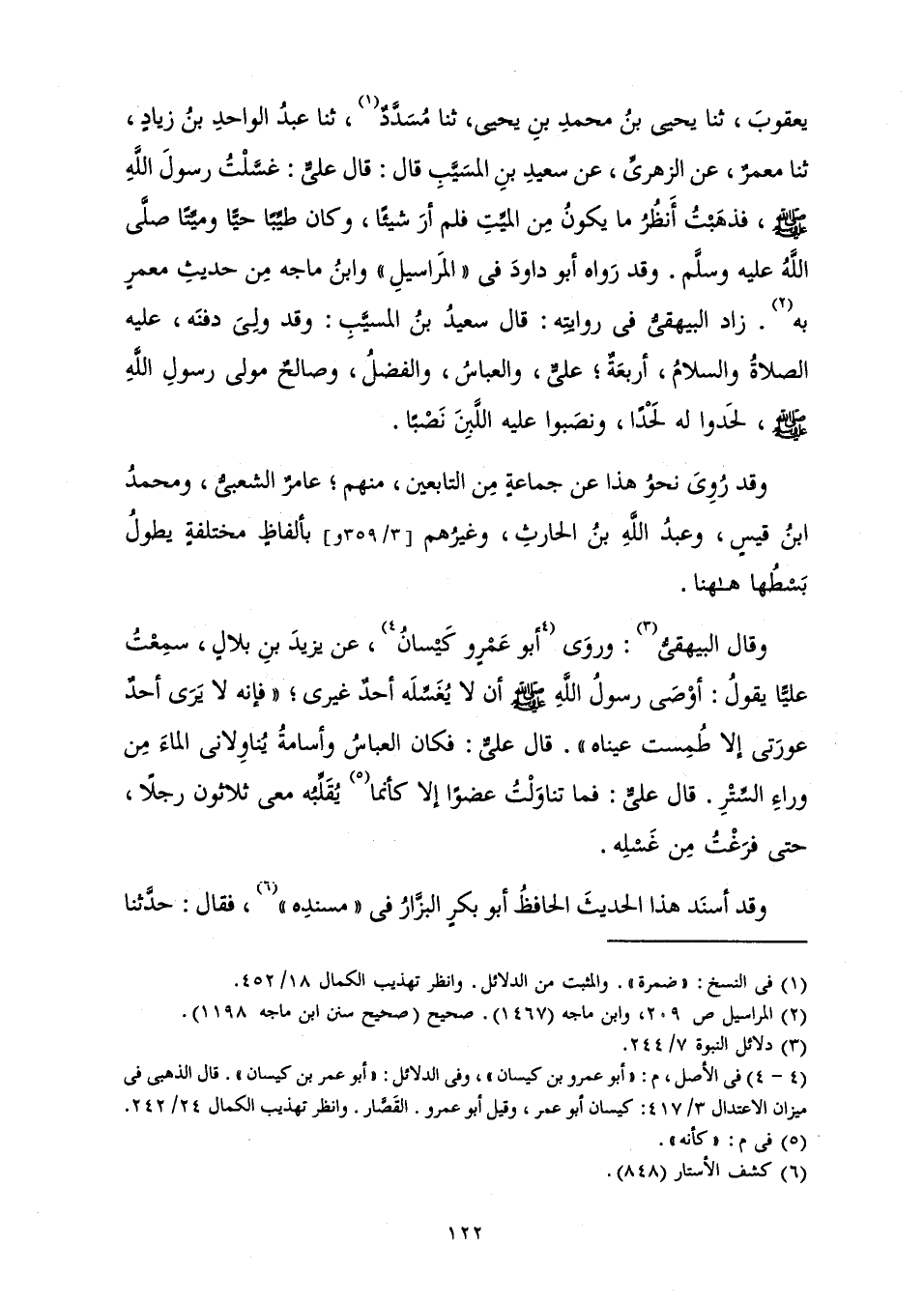 يَعْقُوبَ، ثَنَا يَحْيَى بْنُ مُحَمَّدِ بْنِ يَحْيَى، ثَنَا مُسَدَّدٌ، ثَنَا عَبْدُ الْوَاحِدِ بْنُ زِيَادٍ، ثَنَا مَعْمَرٌ، عَنِ الزُّهْرِيِّ، عَنْ سَعِيدِ بْنِ الْمُسَيِّبِ قَالَ: قَالَ عَلِيٌّ: «غَسَّلْتُ رَسُولَ اللَّهِ صَلَّى اللَّهُ عَلَيْهِ وَسَلَّمَ، فَذَهَبْتُ أَنْظُرُ مَا يَكُونُ مِنَ الْمَيِّتِ فَلَمْ أَرَ شَيْئًا، وَكَانَ طَيِّبًا حَيًّا وَمَيِّتًا صَلَّى اللَّهُ عَلَيْهِ وَسَلَّمَ» . وَقَدْ رَوَاهُ أَبُو دَاوُدَ فِي " الْمَرَاسِيلِ " وَابْنُ مَاجَهْ مِنْ حَدِيثِ مَعْمَرٍ بِهِ. زَادَ الْبَيْهَقِيُّ فِي رِوَايَتِهِ: قَالَ سَعِيدُ بْنُ الْمُسَيِّبِ وَقَدْ وَلِيَ دَفْنُهُ، عَلَيْهِ الصَّلَاةُ وَالسَّلَامُ، أَرْبَعَةٌ عَلِيٌّ، وَالْعَبَّاسُ، وَالْفَضْلُ، وَصَالِحٌ مَوْلَى رَسُولِ اللَّهِ صَلَّى اللَّهُ عَلَيْهِ وَسَلَّمَ، لَحَدَوَا لَهُ لَحْدًا، وَنَصَبُوا عَلَيْهِ اللَّبِنَ نَصْبًا.