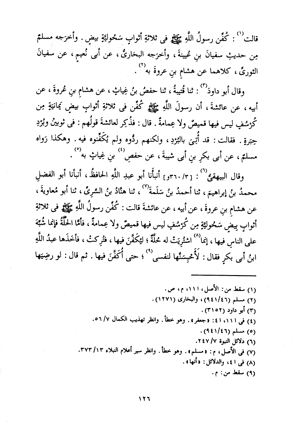 قَالَتْ: «كُفِّنَ رَسُولُ اللَّهِ صَلَّى اللَّهُ عَلَيْهِ وَسَلَّمَ فِي ثَلَاثَةِ أَثْوَابٍ سَحُولِيَّةٍ بَيْضٍ» . وَأَخْرَجَهُ مُسْلِمٌ مِنْ حَدِيثِ سُفْيَانَ بْنِ عُيَيْنَةَ، وَأَخْرَجَهُ الْبُخَارِيُّ، عَنْ أَبِي نُعَيْمٍ، عَنْ سُفْيَانَ الثَّوْرِيِّ، كِلَاهُمَا عَنْ هِشَامِ بْنِ عُرْوَةَ بِهِ.