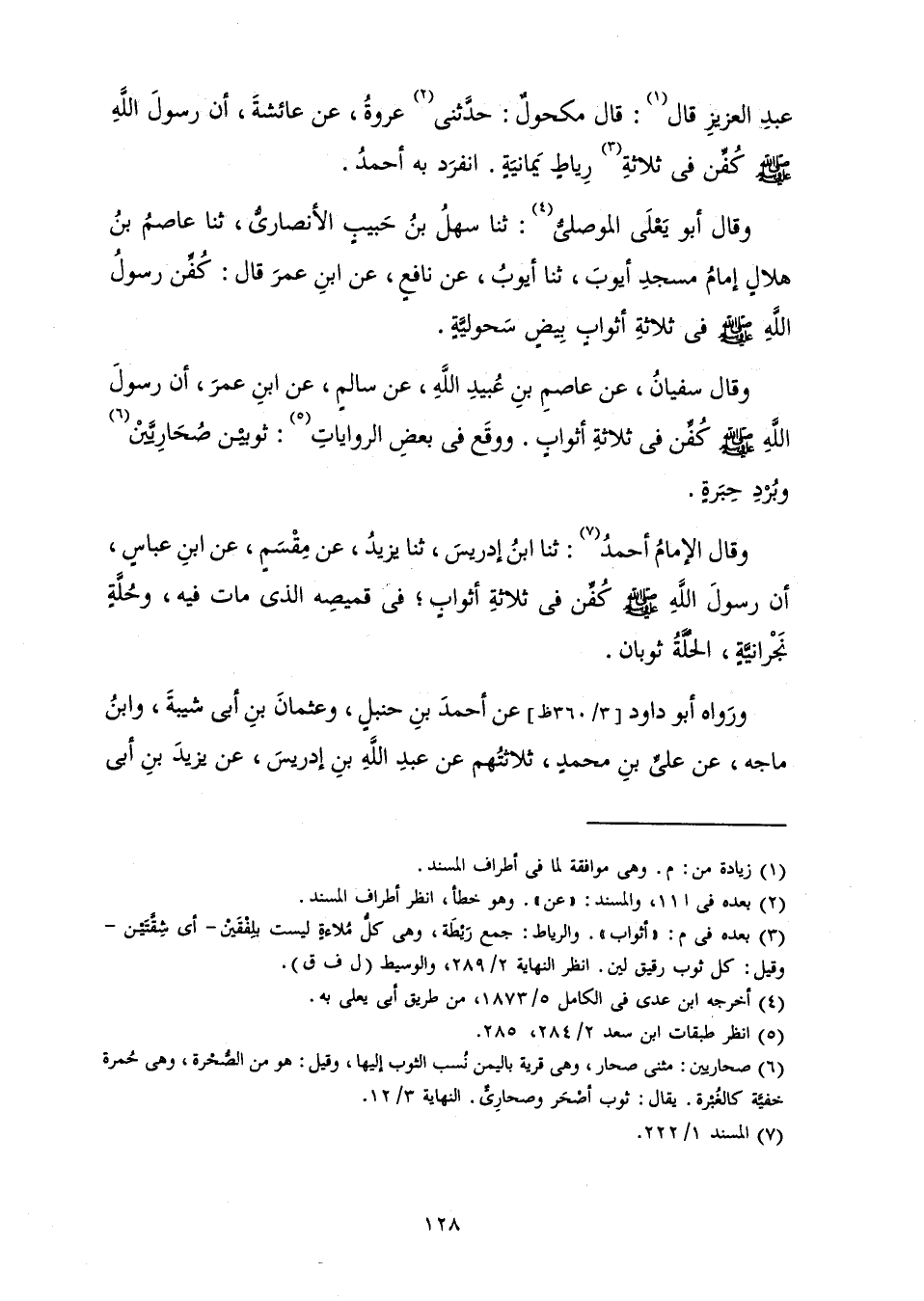 وَقَالَ الْإِمَامُ أَحْمَدُ: ثَنَا ابْنُ إِدْرِيسَ، ثَنَا يَزِيدُ، عَنْ مِقْسَمٍ، عَنِ ابْنِ عَبَّاسٍ، «أَنَّ رَسُولَ اللَّهِ صَلَّى اللَّهُ عَلَيْهِ وَسَلَّمَ كُفِّنَ فِي ثَلَاثَةِ أَثْوَابٍ ; فِي قَمِيصِهِ الَّذِي مَاتَ فِيهِ، وَحُلَّةٍ نَجْرَانِيَّةٍ،» الْحُلَّةُ ثَوْبَانِ.
