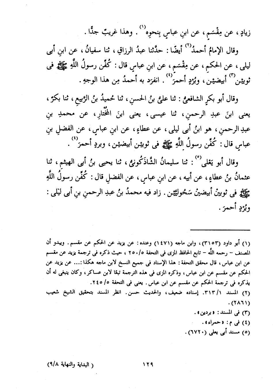 وَقَالَ الْإِمَامُ أَحْمَدُ أَيْضًا: حَدَّثَنَا عَبْدُ الرَّزَّاقِ، ثَنَا سُفْيَانُ، عَنِ ابْنِ أَبِي لَيْلَى، عَنِ الْحَكَمِ، عَنْ مِقْسَمٍ، عَنِ ابْنِ عَبَّاسٍ قَالَ: «كُفِّنَ رَسُولُ اللَّهِ صَلَّى اللَّهُ عَلَيْهِ وَسَلَّمَ فِي ثَوْبَيْنِ أَبْيَضَيْنِ، وَبُرْدٍ أَحْمَرَ» . انْفَرَدَ بِهِ أَحْمَدُ مِنْ هَذَا الْوَجْهِ.