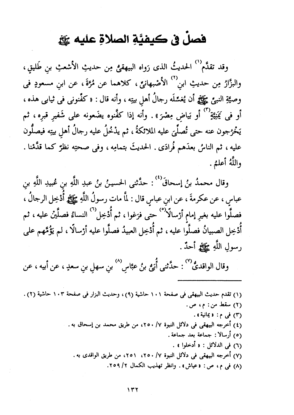 وَقَدْ تَقَدَّمَ الْحَدِيثُ الَّذِي رَوَاهُ الْبَيْهَقِيُّ مِنْ حَدِيثِ الْأَشْعَثِ بْنِ طَلِيقٍ، وَالْبَزَّارُ مِنْ حَدِيثِ ابْنِ الْأَصْبَهَانِيِّ، كِلَاهُمَا عَنْ مُرَّةَ، عَنِ ابْنِ مَسْعُودٍ «فِي وَصِيَّةِ النَّبِيِّ صَلَّى اللَّهُ عَلَيْهِ وَسَلَّمَ أَنْ يُغَسِّلَهُ رِجَالُ أَهْلِ بَيْتِهِ، وَأَنَّهُ قَالَ: كَفِّنُونِي فِي ثِيَابِي هَذِهِ، أَوْ فِي يَمَنِيَّةٍ أَوْ بَيَاضِ مِصْرَ وَأَنَّهُ إِذَا كَفَّنُوهُ يَضَعُونَهُ عَلَى شَفِيرِ قَبْرِهِ، ثُمَّ يَخْرُجُونَ عَنْهُ حَتَّى تُصَلِّيَ عَلَيْهِ الْمَلَائِكَةُ، ثُمَّ يَدْخُلُ عَلَيْهِ رِجَالُ أَهْلِ بَيْتِهِ فَيُصَلُّونَ عَلَيْهِ، ثُمَّ النَّاسُ بَعْدَهُمْ فُرَادَى» . الْحَدِيثَ بِتَمَامِهِ، وَفِي صِحَّتِهِ نَظَرٌ كَمَا قَدَّمْنَا. وَاللَّهُ أَعْلَمُ.