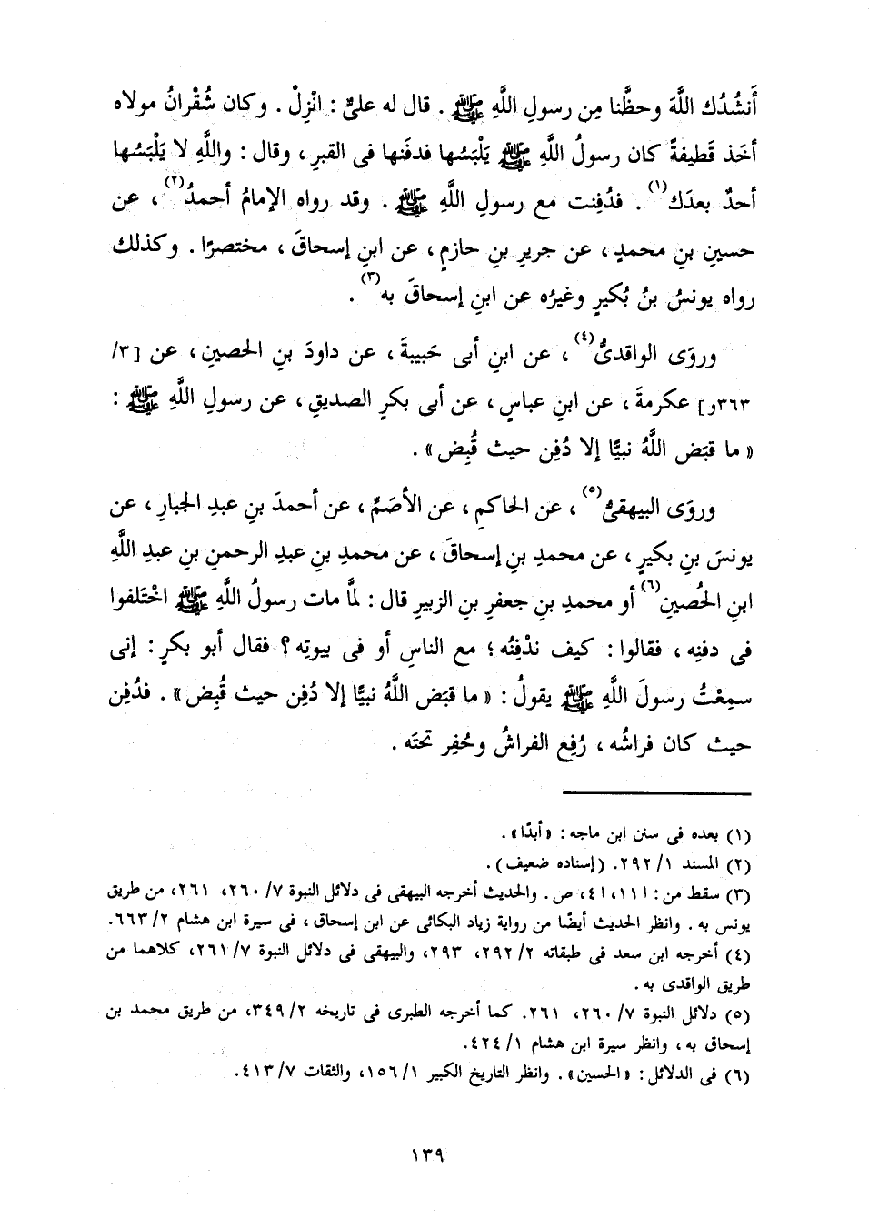 وَرَوَى الْبَيْهَقِيُّ، عَنِ الْحَاكِمِ، عَنِ الْأَصَمِّ، عَنْ أَحْمَدَ بْنِ عَبْدِ الْجَبَّارِ، عَنْ يُونُسَ بْنِ بُكَيْرٍ، عَنْ مُحَمَّدِ بْنِ إِسْحَاقَ، عَنْ مُحَمَّدِ بْنِ عَبْدِ الرَّحْمَنِ بْنِ عَبْدِ اللَّهِ بْنِ الْحُصَيْنِ أَوْ مُحَمَّدِ بْنِ جَعْفَرِ بْنِ الزُّبَيْرِ قَالَ: «لَمَّا مَاتَ رَسُولُ اللَّهِ صَلَّى اللَّهُ عَلَيْهِ وَسَلَّمَ اخْتَلَفُوا فِي دَفْنِهِ، فَقَالُوا: كَيْفَ نَدْفِنُهُ ; مَعَ النَّاسِ أَوْ فِي بُيُوتِهِ؟ فَقَالَ أَبُو بَكْرٍ: إِنِّي سَمِعْتُ رَسُولَ اللَّهِ صَلَّى اللَّهُ عَلَيْهِ وَسَلَّمَ يَقُولُ " مَا قَبَضَ اللَّهُ نَبِيًّا إِلَّا دُفِنَ حَيْثُ قُبِضَ " فَدُفِنَ حَيْثُ كَانَ فِرَاشُهُ، رُفِعَ الْفِرَاشُ وَحُفِرَ تَحْتَهُ» .